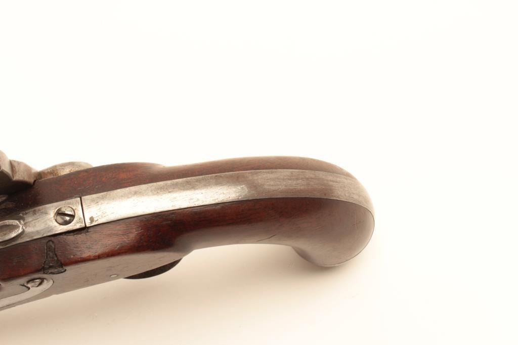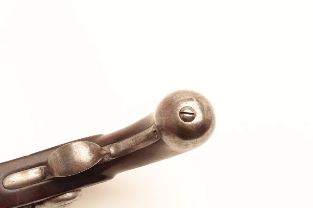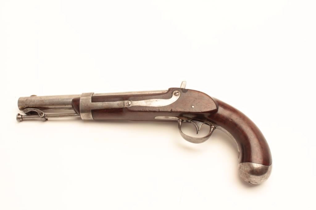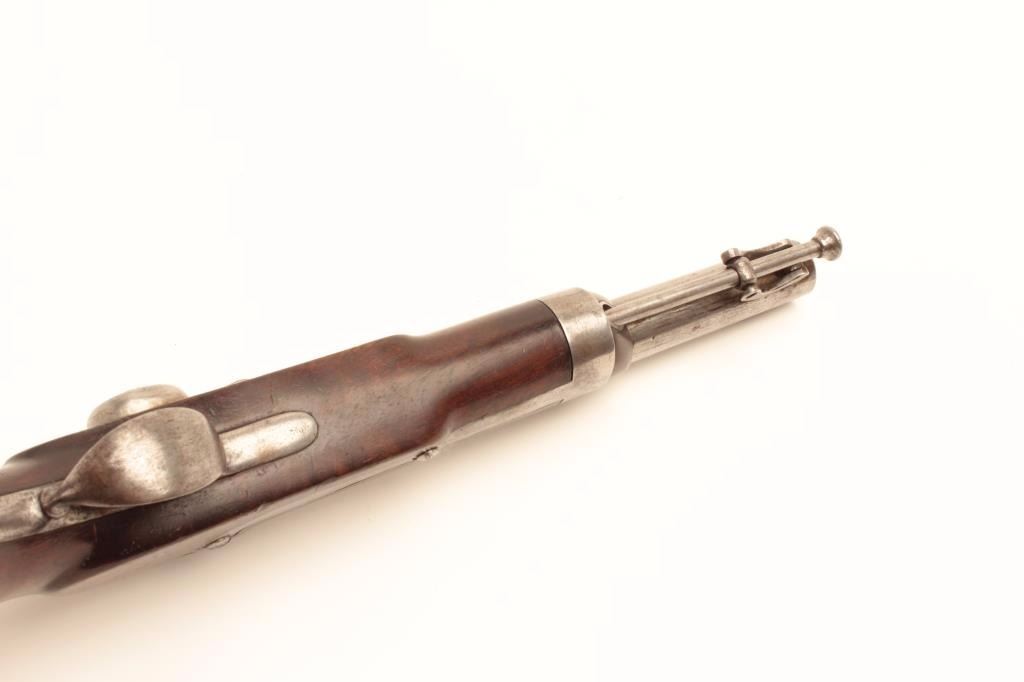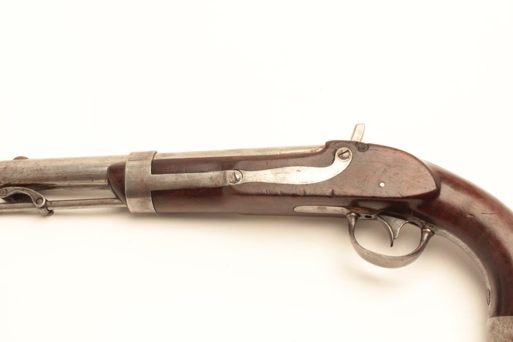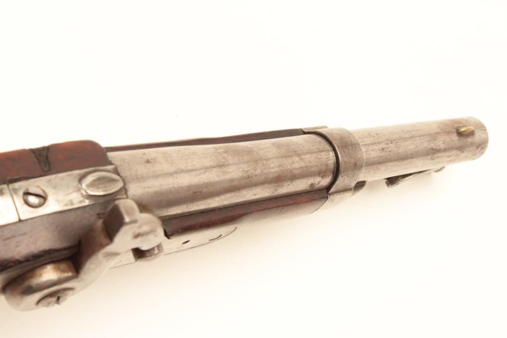 Interesting conversion of U.S. Martial flintlock to percussion with S. North hand stamped on the lock in .54 caliber. Several differences to 1836 model in flatness of lock plate and L.F. and P proofs on the leftbreech of the barrel. Refer “Flat lock” Waters for similar configured lock plate. (Antique) Est.: $350-$700