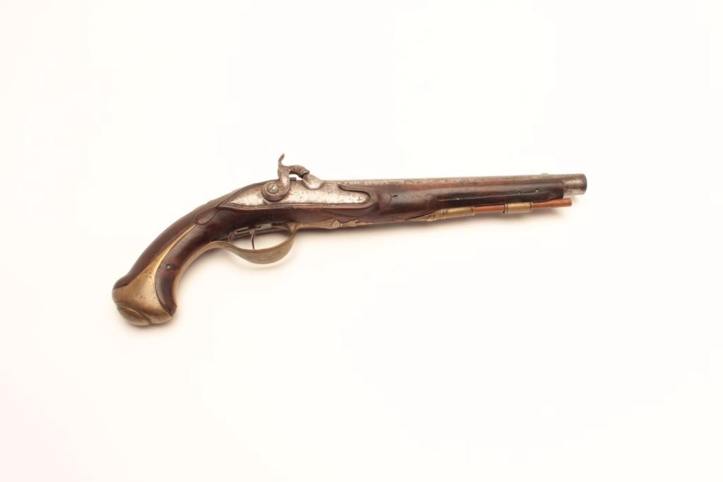 Early 19th century flintlock pistol converted to percussion possibly German. Measures 15 ½” overall with a 9” barrel of approximately .50 plus caliber smoothbore. Good overall with fore end cap missing and ramrodreplaced. Works well. As found condition and would improve with T.L.C. (Antique) Est.: $225-$450