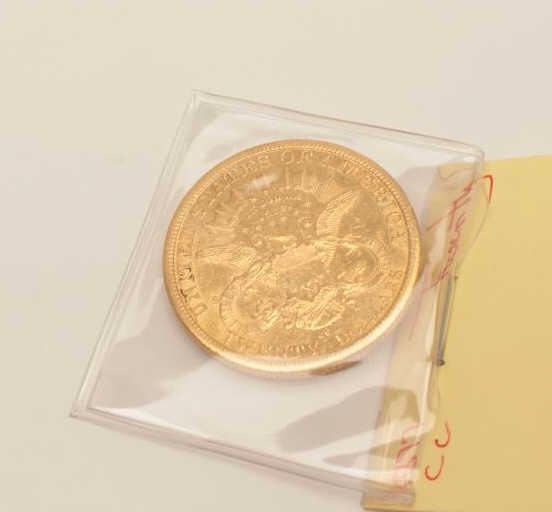 Lot 1639 1877 $20 U.S. gold Carson City mint. Not professionally graded. Cleaned slightly. XF. Old collecto