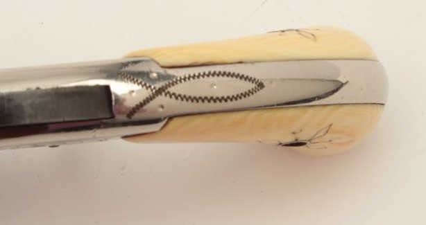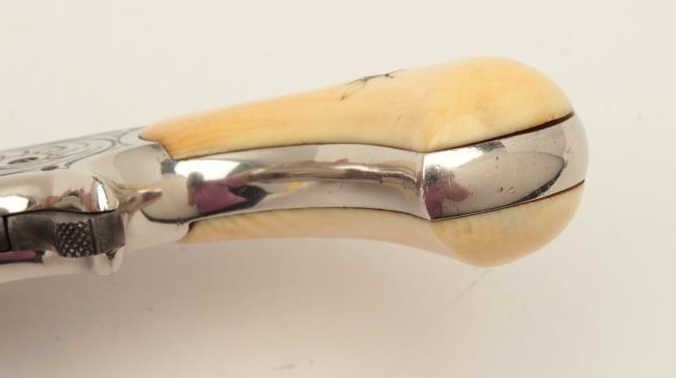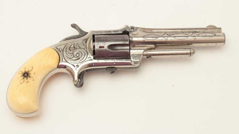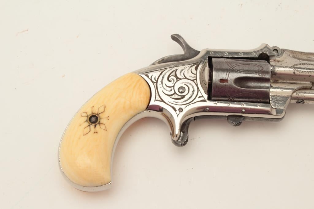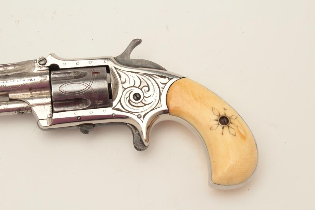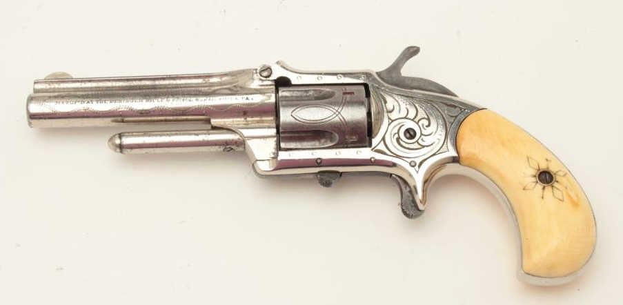 Derringer Rifle & Pistol Works spur trigger revolver, .32RF caliber, 3.5” barrel, period engraved, nickel finish, period ivory grips, S/N 373, in overall very good to near fine condition displaying the majority of itsoriginal finish on frame and barrel assembly, crisp action, sharp markings and beautiful ivory grips showing carved decoration around the grip screw escutcheons. (Antique). Est.: $400-800.