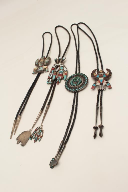 Lot 1671 Collection of 4 Zuni bolo ties, 2 signed, 1970’s. From the estate of Elmer E. Taylor. Est.: