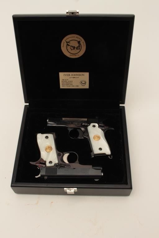 Custom double cased set of Iver Johnson Pony Model semi-automatic pistols, .380 caliber, 3.25” barrels, S/Ns IJ004431 and IJ007404, blued finish (first gun is mat finished, second is bright polished), simulated pearlmedallion grips, in overall excellent condition displaying little use; casing is lined in black material with descriptive plaques. (Modern/PPT). Est.: $600-$1,200.