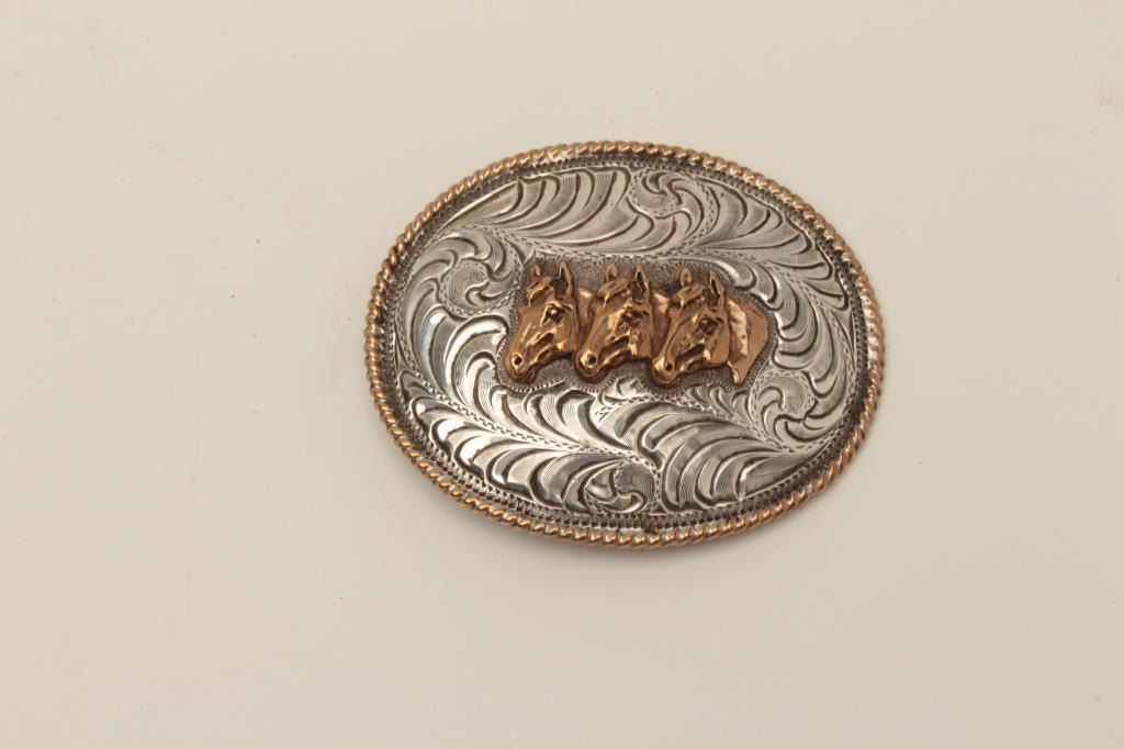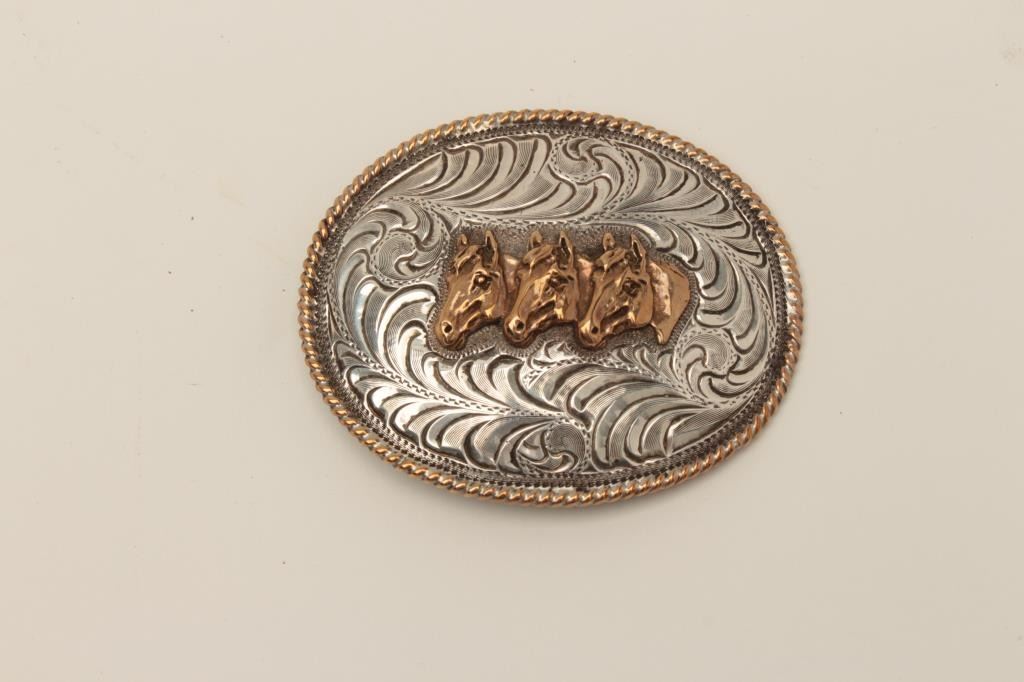 Vintage sterling marked western style belt buckle with 3 stallions at the center. Hand engraved and measures 3 ½” across the center. Est.: $150-$300