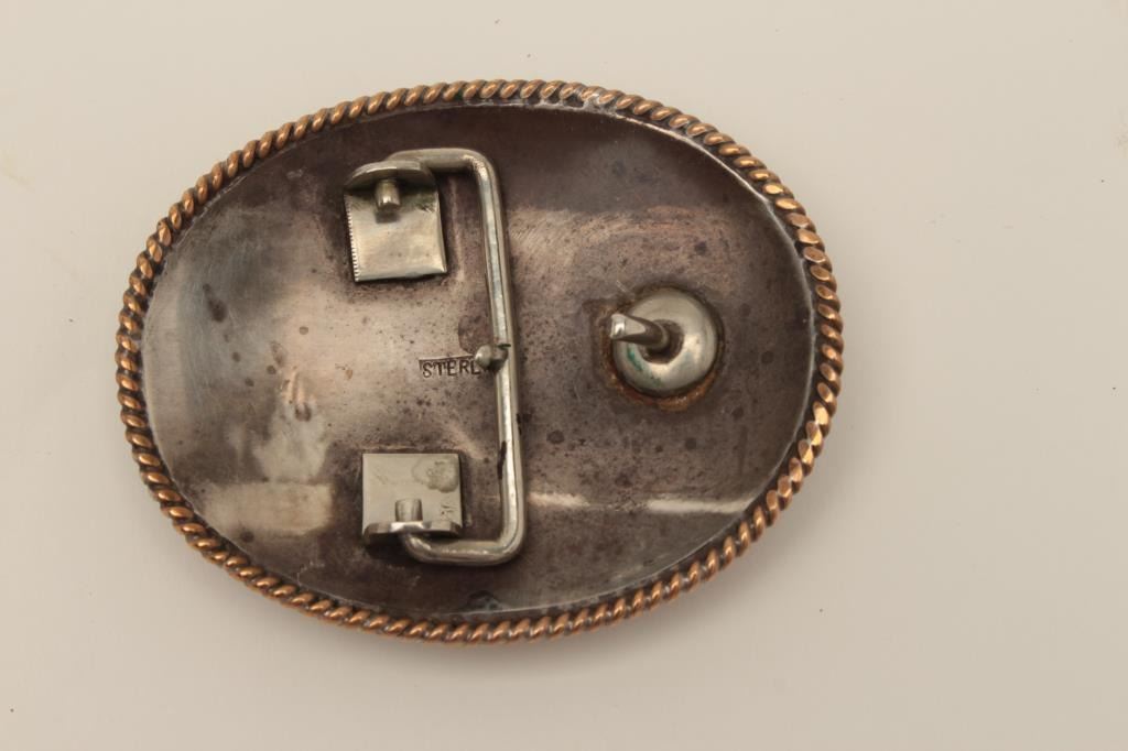Lot 1730 Vintage sterling marked western style belt buckle with 3 stallions at the center. Hand engraved an