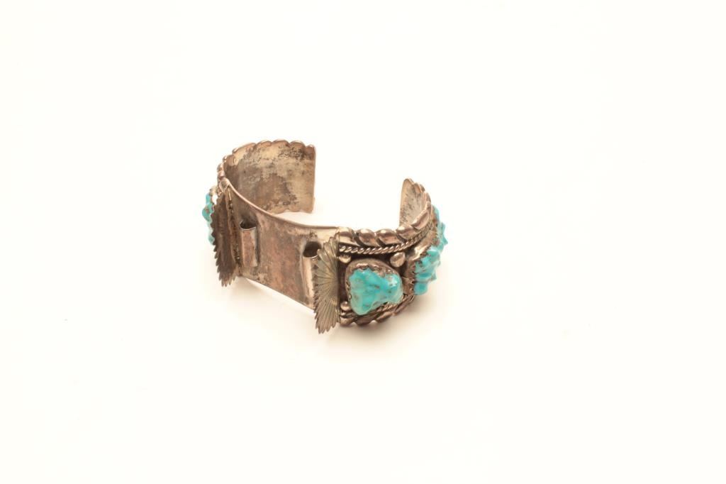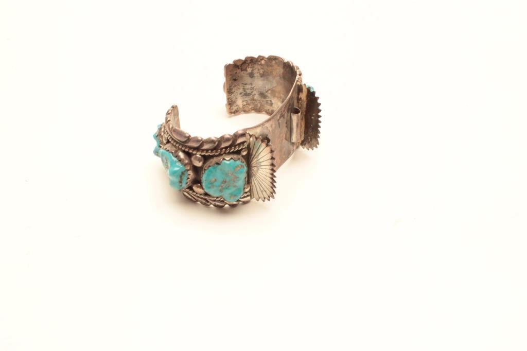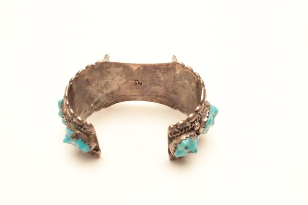 Highly stylized turquoise bracelet for a watch. The band is marked RLB on the underside and there no additional markings. The bracelet band is encrusted with turquoise nuggets and a high degree of detail to the metal work, a nice piece. Est.: $125-$250.