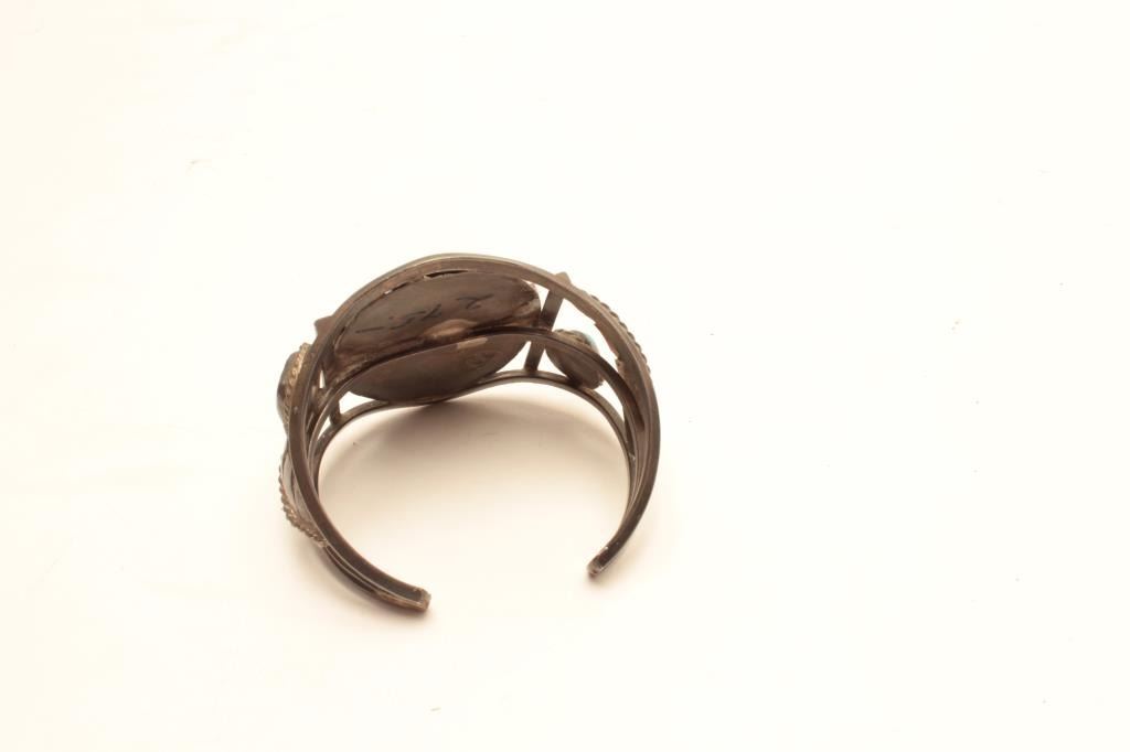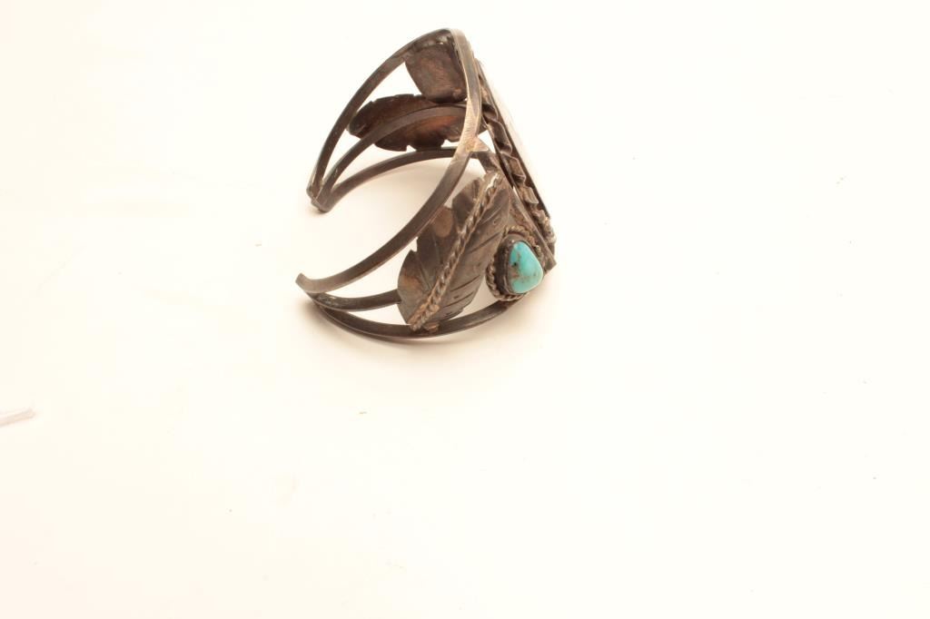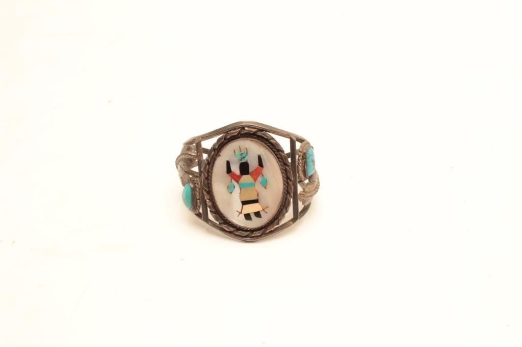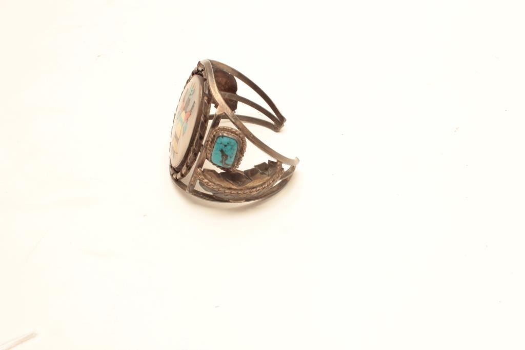 Apache turquoise and mother of pearl inlayed bracelet. The bracelet is in very good overall condition with stylized feathers and turquoise stones on the sides. The centerpiece is mother of pearl with stoneinlay depicting a Gahn dancer all set in white metal. A very ornate piece. Est.: $125-$250.