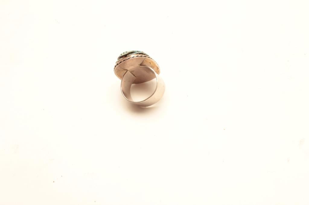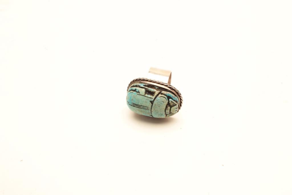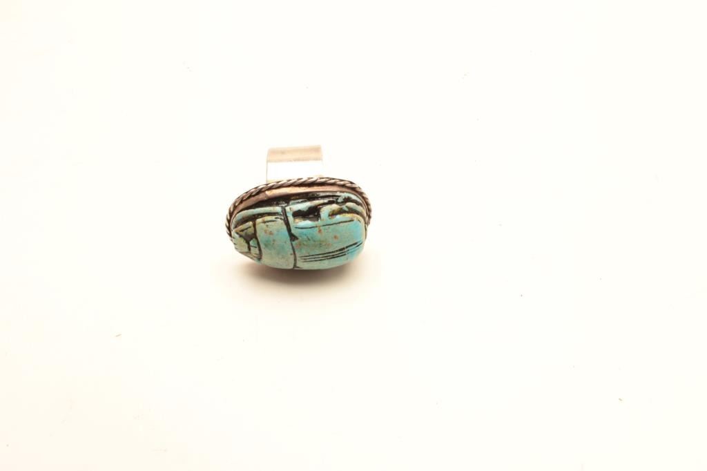 Turquoise scarab beetle ring. The ring is unmarked and unsigned with an Egyptian scarab beetle portrayed on top. Est.: $25-$50.