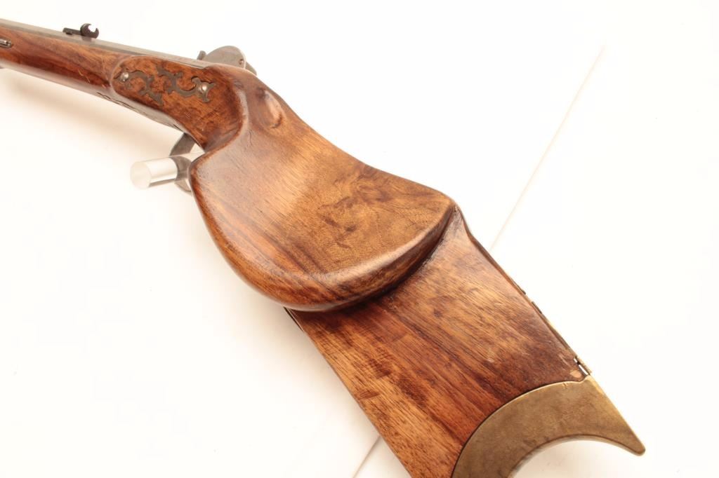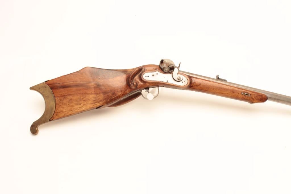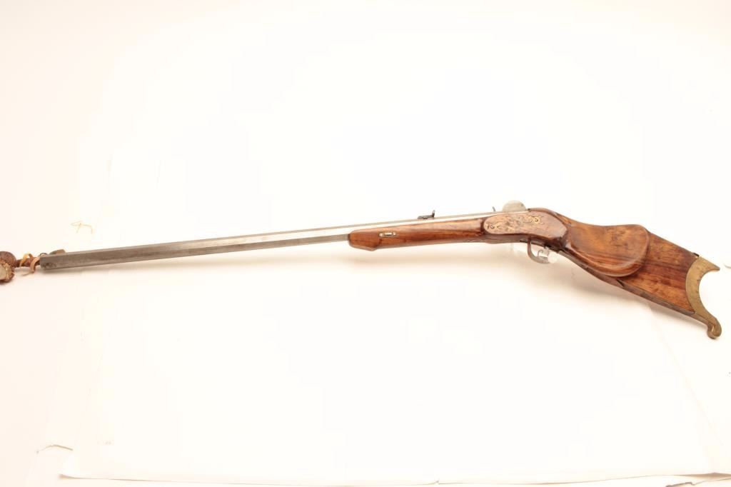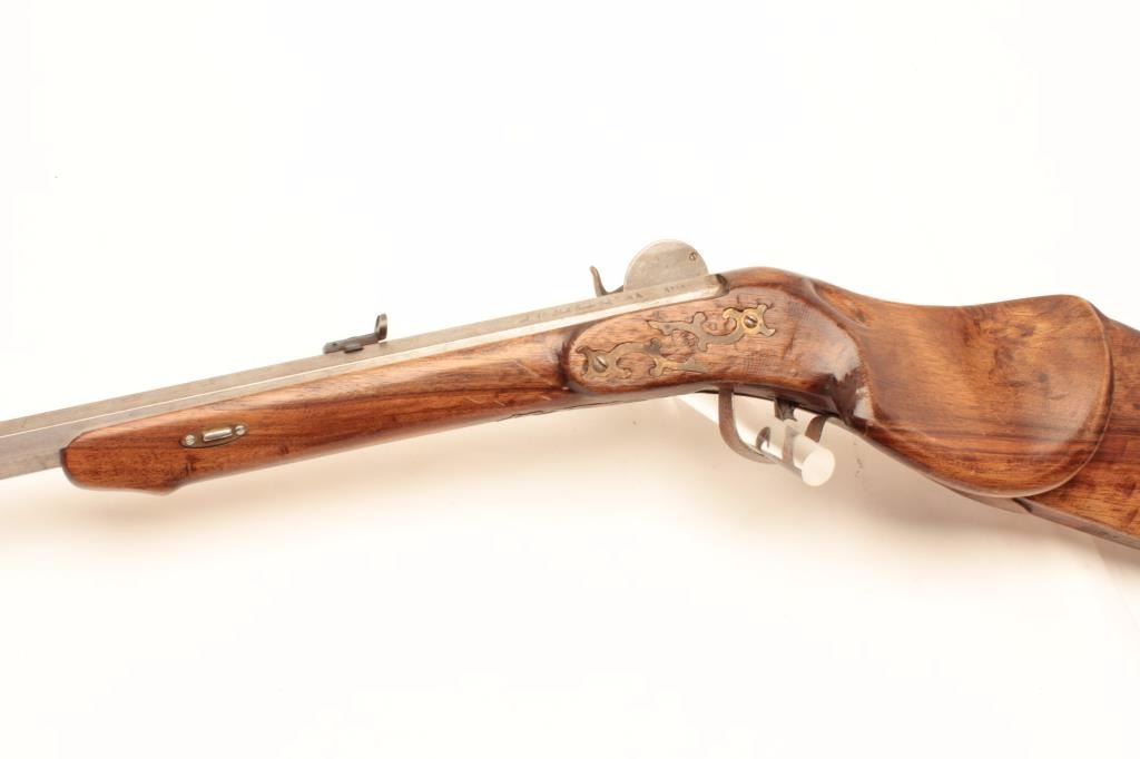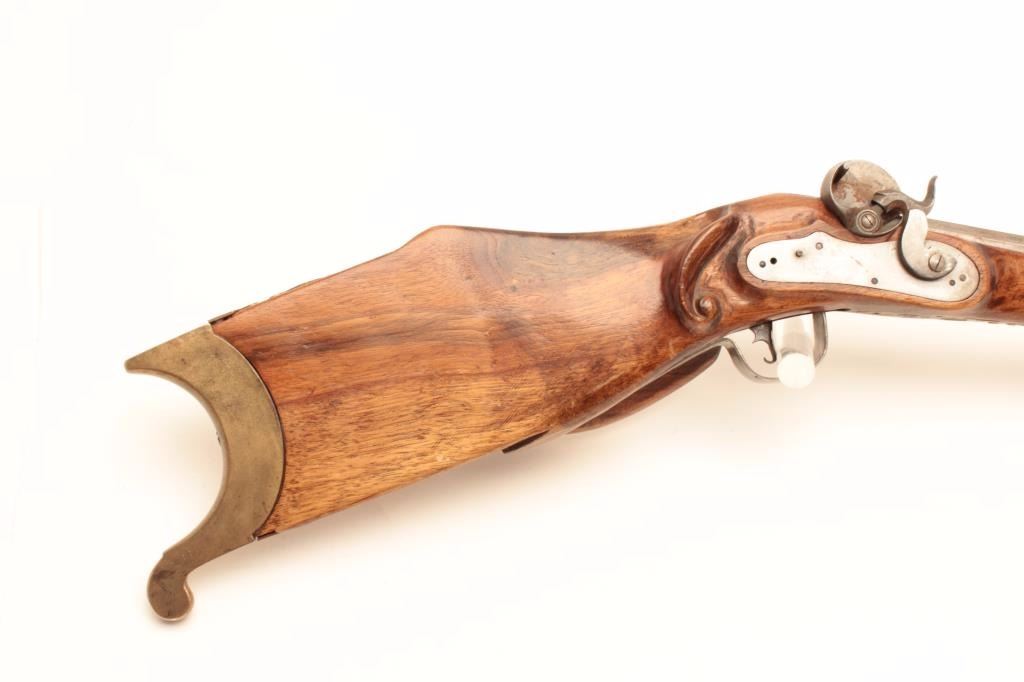 Vintage Italian Schuetzen percussion rifle marked P.Bondini, approximately .45 caliber with a 32” octagon barrel. The rifle is in good overall condition with a brass blade front and adjustable rear sights. The barrel and side plate remain in the white with some light surface rust noted. The highly figured smooth wood stock is in good condition with small mars and compressions. The hardware is all brass except for thetrigger guard which is steel. The lot includes a full-length ram rod with a stag grip added. Est.: $375-$750.