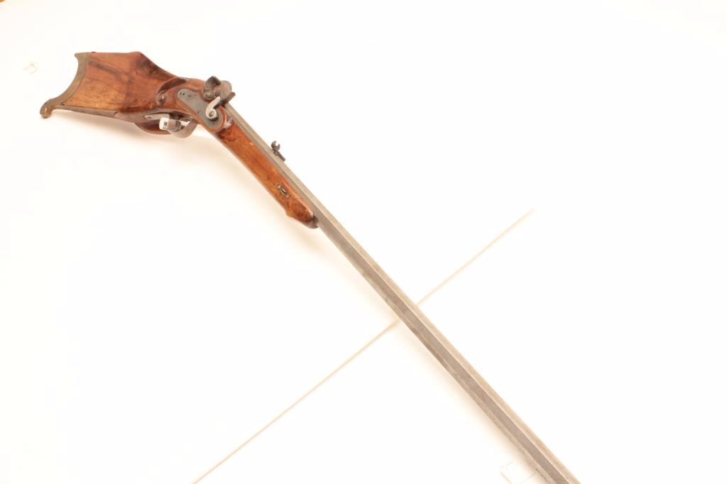 Lot 2027 Vintage Italian Schuetzen percussion rifle marked P.Bondini, approximately .45 caliber with a 32”