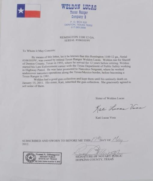 Lot 74 Texas Ranger Weldon Lucas' Remington 1100 12GA