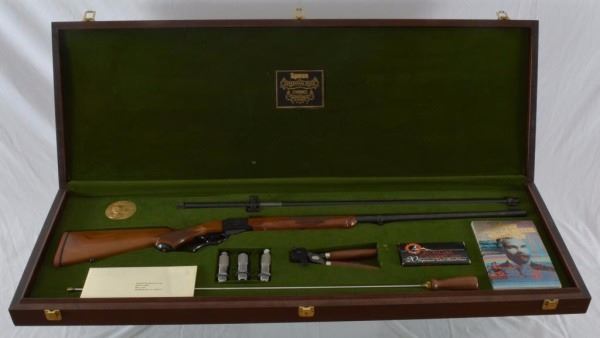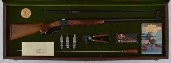 * 27" barrel. Walnut; checkered stock. Open Sights; Scope Rings; Sling Swivels; Case; Scope; Dies; Rod. Warning; 'Lyman Centennial' & 'L-78-0692'. Blued Steel; Engraved. New condition.