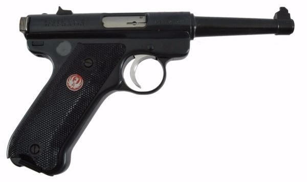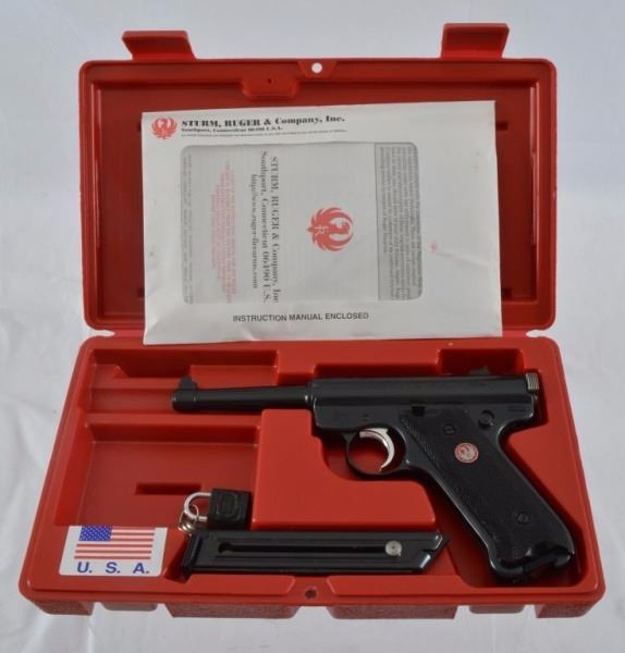 * Pistol. 4.75". MK450. Black Plastic w/Silver Eagle. Fixed Sights, Padlock, Two (2) Clips, Red Plastic Box. Red Eagle Background on Grip Medallions. New in Box. Blued Steel.