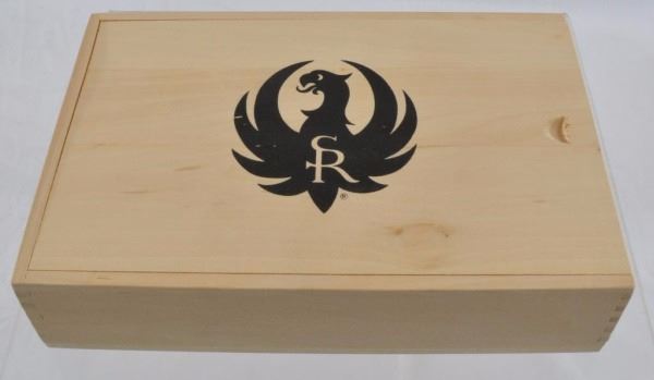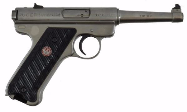* Pistol. 4.75". Black Plastic; Checkered. Fixed Sights; Wooden Salt Fish Box. '1 of 5000' on Barrel; 'Wm. B. Ruger' Signature on Chamber. New in Box. Stainless Steel; Tapered Barrel.