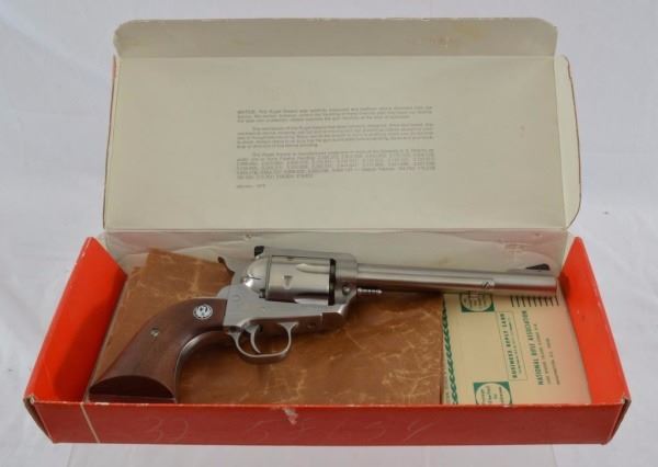 * 6.5" barrel. Walnut w/White Eagle grips. Ruger Logo on Barrel. Stainless Steel; Type 3 Ejector. New in Box.