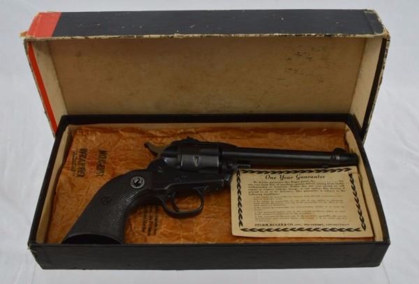 * 5-1/2" barrel. Black Plastic; Checkered grips. Blued Steel; Flat Loading Gate; Type 1 Serrated Ejector. 98% condition.
