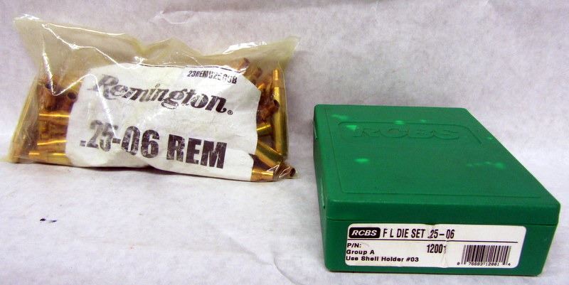 RCBS FL DIE SET FOR 25-06 REM, IN GOOD CONDITION. BAG OF 50 PIECES UNPRIMED REMINGTON BRASS.