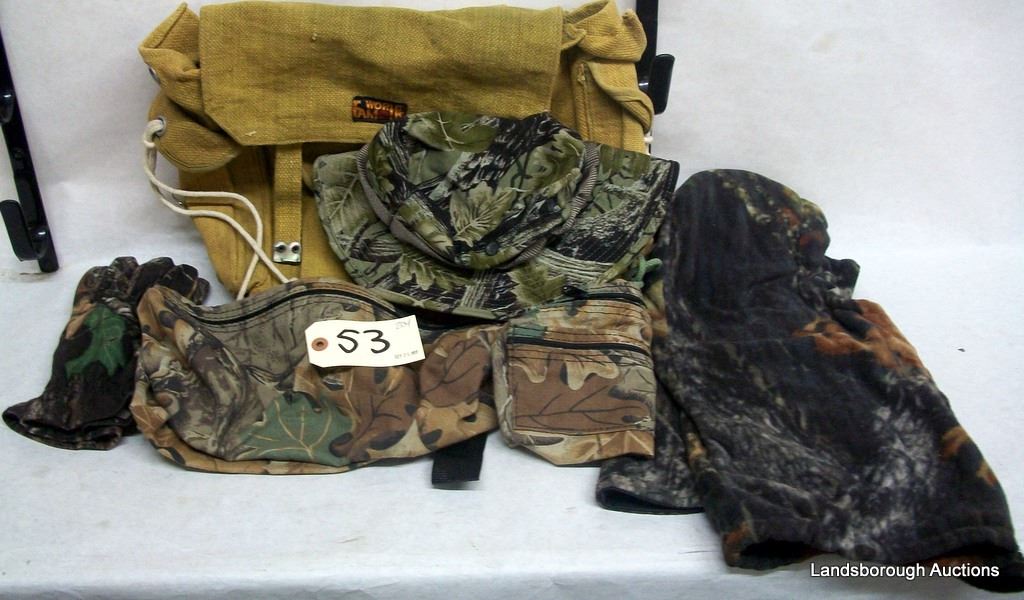 ONE SZ.36 BELT, ONE SKS RIFLE SLING, ONE WORLD FAMOUS BACKPACK, TWO BALACLAVAS, ONE RABBIT FUR BOMBER HAT, ONE CAMO HAT, ONE PAIR OF MENS SZ.10 HIP WADERS, ONE CAMO FANNY PACK, ONE PAIR OF MENS SZ.9.5 BROWNING LEATHER BOOTS IN EXCELLENT INTERIOR CONDITION, ONE MENS SZ.L THIN HUNTING GLOVES, 300FT OF TWISTED POLY ROPE, PLUS VARIOUS LENGTHS OF PARACORD, CLOTHESLINE, NYLON, AND TWINE.