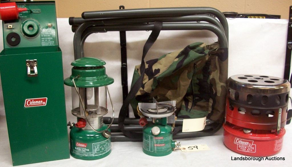 ONE CAMP CHAIR, ONE COLEMAN LAMP, ONE COLEMAN CATALYTIC HEATER, AND ONE COLEMAN CAMPER STOVE.