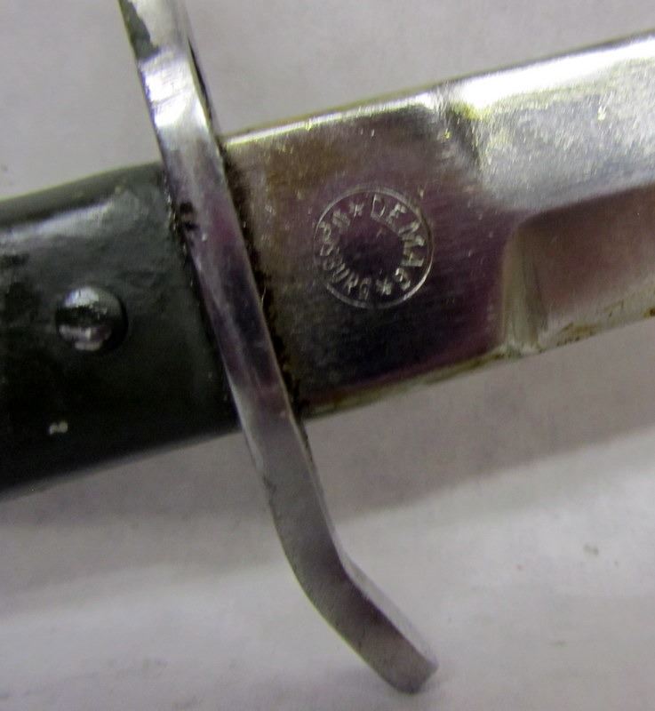 MARKED "GESETZLICH GESCHUTZT" ON ONE SIDE OF BLADE, "DEMAG DUISBURG" ON OTHER SIDE. BLADE IS COATED IN COSMOLINE AND IS IN GOOD CONDITION. HANDLE HAS SOME PAINT WEAR. SCABBARD HAS SOME WEAR MARKS.