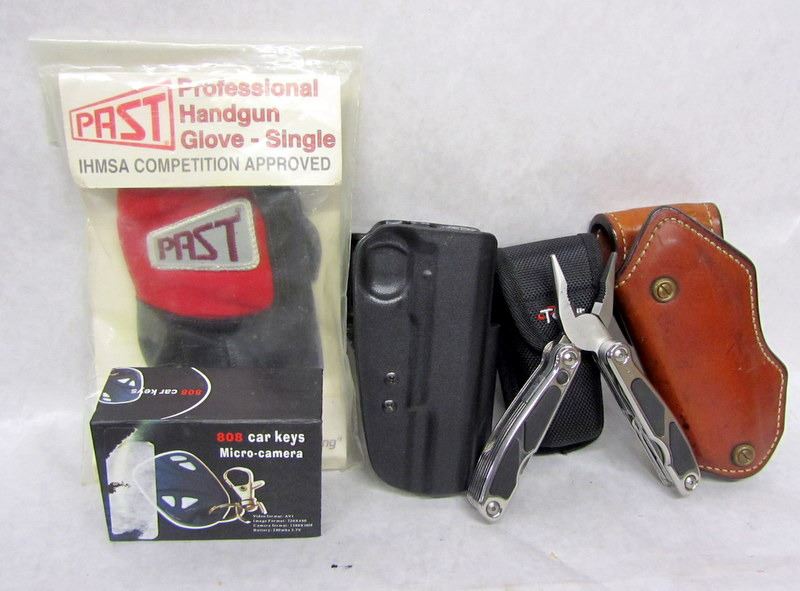 ERNIE HILL SPEEDHOLSTER FOR 1911 PISTOL. 808 CAR KEY FOB MICRO CAMERA. UNCE MIKE'S KYDEX 1911 HOLSTER. TEKUT MULTITOOL WITH CASE. P.A.S.T. COMPETITION SHOOTING GLOVE.