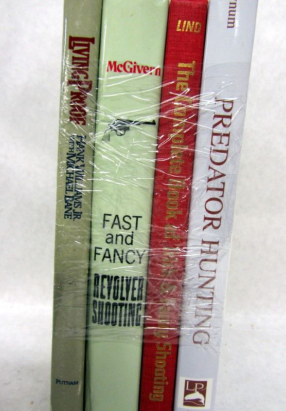 "FAST AND FANCY REVOLVER SHOOTING" BY MCGIVERN. "LIVING PROOF" BY HANK WILLIAMS JR. "THE COMPLETE BOOK OF TRICK AND FANCY SHOOTING" BY ERNIE LIND. "PREDATOR HUNTING" BY BILL BYNUM.