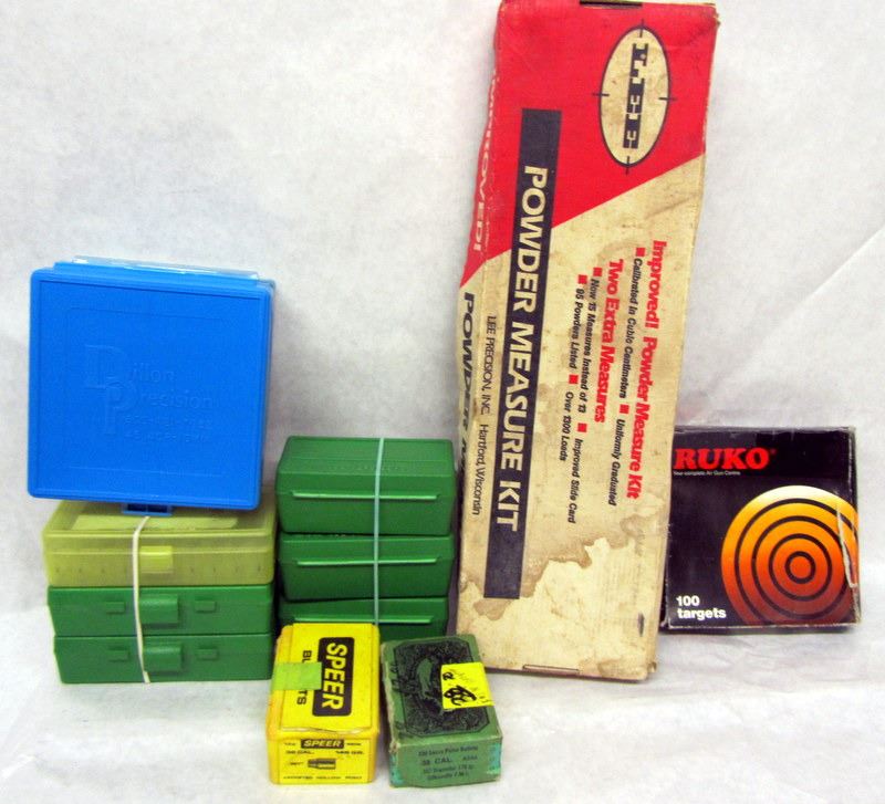 LEE POWDER MEASURE KIT. MTM AND DILLON CATRIDGE BOXES FOR 38 SPL. AND 45 ACP. SPEER AND SIERRA .38 CALIBER BULLETS (170 GR. AND 146 GR.). PACKAGE OF RUKO AIRGUN TARGETS.