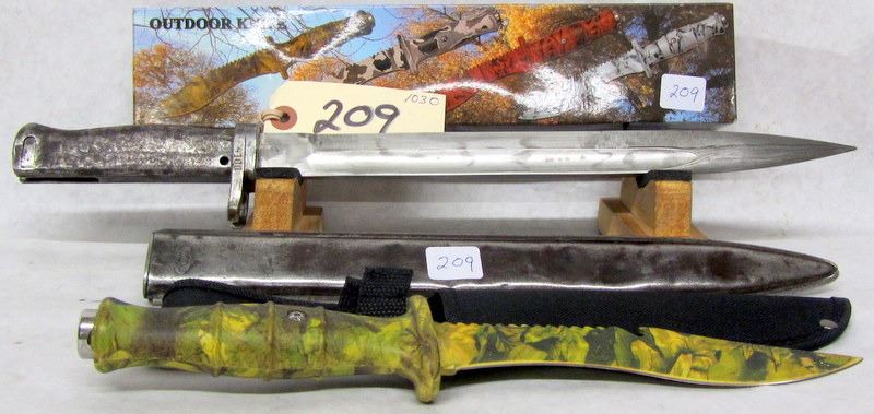 12" CAMO SURVIVOR KNIFE IN GOOD SHAPE WITH BLACK NYLON SHEATH, UNKNOWN 12" BAYONETWITH METAL SHEATH