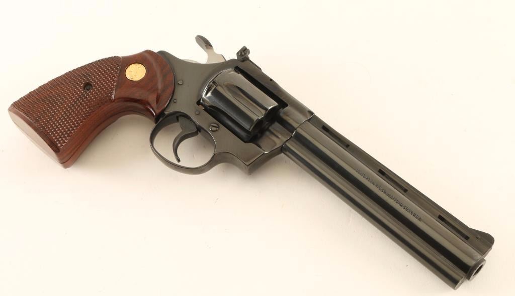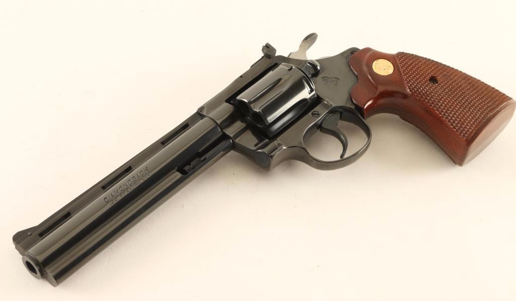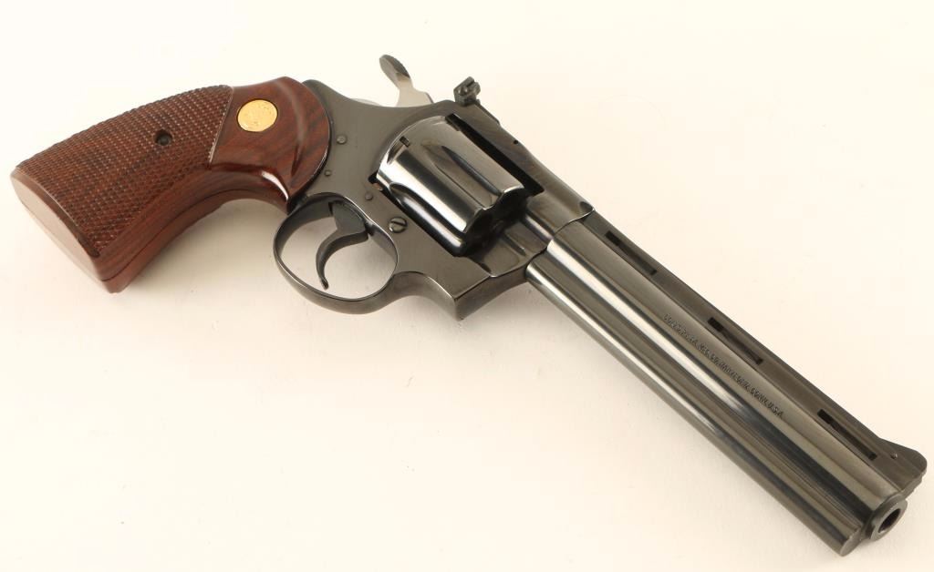 Desirable medium frame double-action revolver chambered in .38 Special, circa 1978-1986. Features a blued finish, 6" vent ribbed barrel with full underlug, raised ramp front sight, adjustable rear window sight, fluted six-shot cylinder, smooth trigger, large serrated hammer spur and two-piece checkered walnut grips with gold Colt medallions. Revolver exhibits approximately 99% of it's original blued finish showing some minor handling marks and a faint drag line on the cylinder. Action is super smooth with solid lock-up, bore is excellent and wood grips are fine. Condition is near new. ***Modern Firearm***