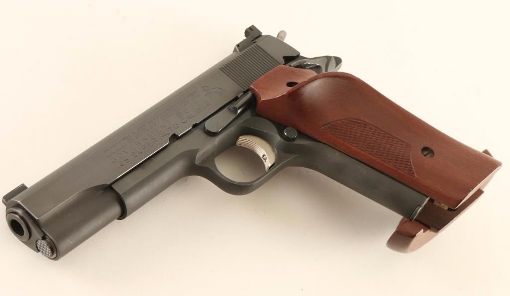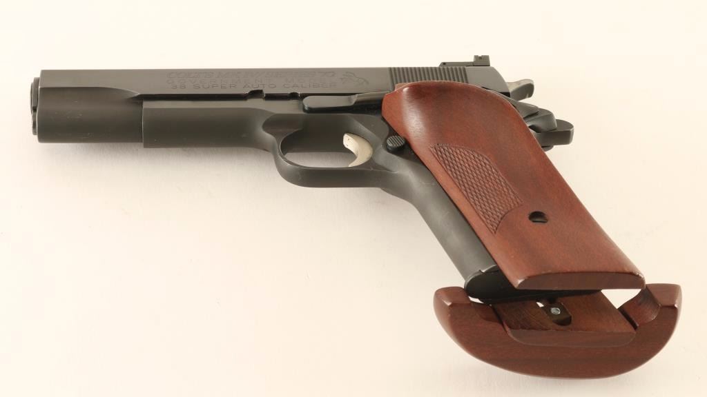 'MK IV/Series 70' Quality 1911-A1 style single action semi-automatic pistol chambered in .38 Super. Features a bright blued finish, 5" barrel, patridge front sight, Micro adjustable rear window sight, serrated adjustable trigger, thumb safety, beavertail grip safety, serrated hammer spur, push button magazine release, factory 9 round magazine, serrated arched mainspring housing and custom two-piece checkered target grips with adjustable hand rest. Pistol retains approximately 97% of it's original blued finish showing scattered small spots of minor wear and some light handling marks/scratches. Action is smooth, bore is pristine and wood grips are near fine with a couple small losses. Condition is excellent. ***Modern Firearm***