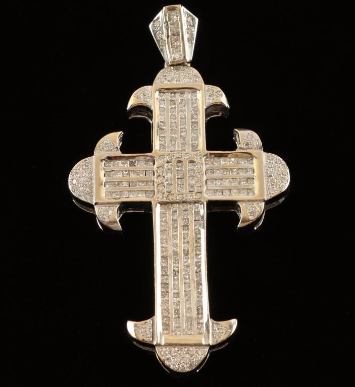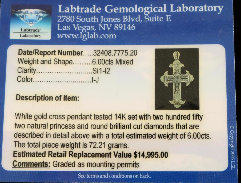 Heavy white gold 14kt cross with two hundred fifty princess and round cut diamonds, total weight 6.00cts. Clarity SI 1-12. TW weight of piece 72.21grams. Includes a Labtrade Geological Laboratory card and with a estimated retail replacement value of 14,995.00