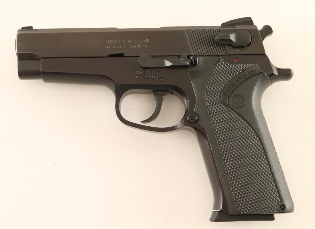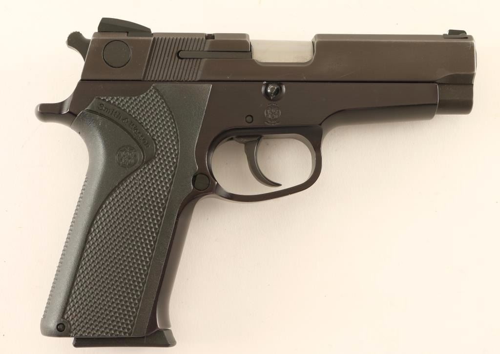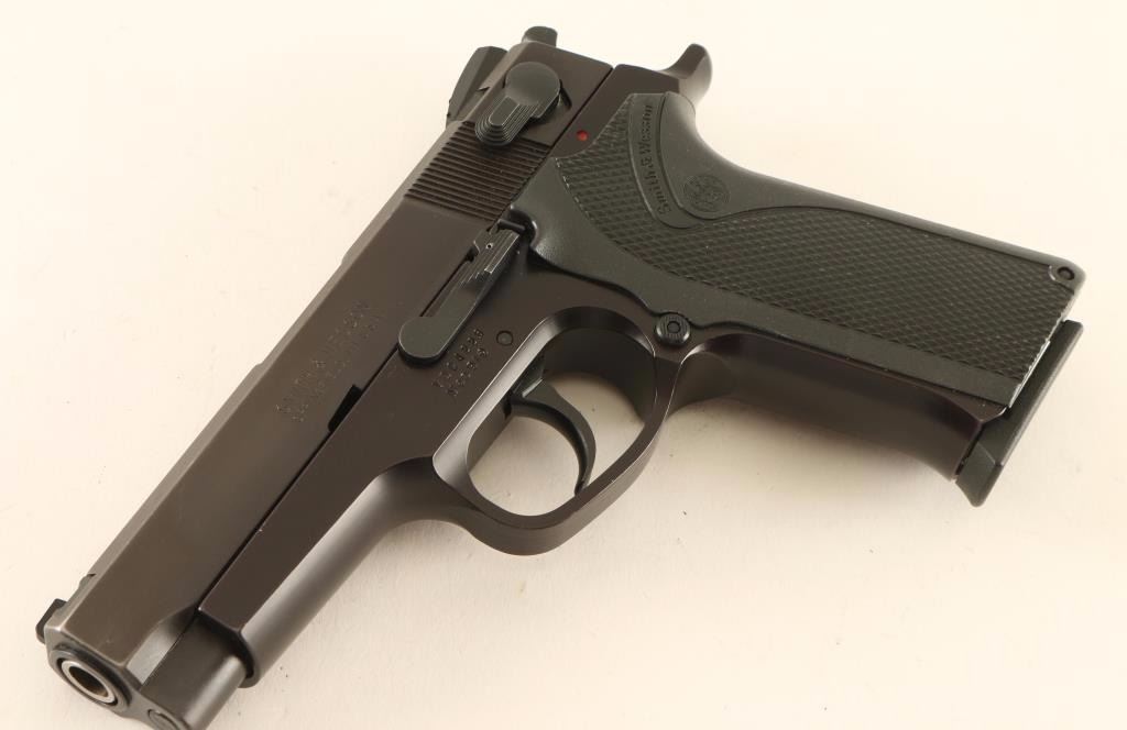 Full-size double action semi-automatic pistol chambered in 9x19mm. Features a matte blued finished slide, 4" barrel, dovetailed three-dot sights, thumb safety/decocker, black finished aluminum alloy frame, .305" smooth combat trigger, .260" hammer with serrated round spur, push button magazine release, 10 round factory magazine and one-piece checkered black Xenoy wrap around grips with S&W insignias. Pistol retains approximately 97% of it's original finish showing minor muzzle wear & handling wear, slide wear on the barrel and strike marks on the frame from the back of the hammer. Action is strong, bore is excellent and synthetic grips are fine. Condition is excellent. ***Modern Firearm***