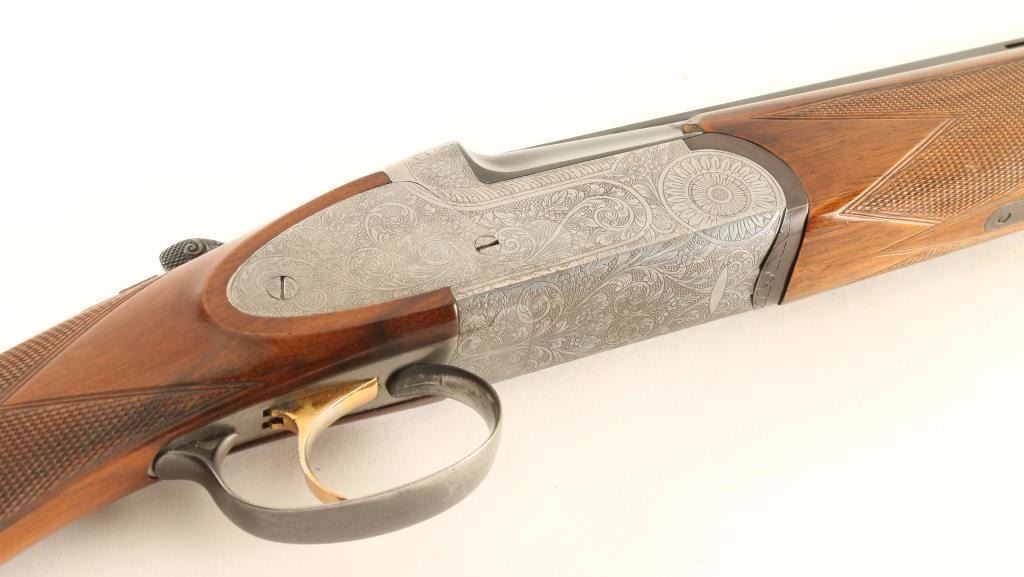 Engraved Italian made over/under double barrel boxlock shotgun chambered for 2 3/4" 28 gauge shells, circa 1981. Features blued 28" vent ribbed barrels with imp mod/mod chokes, silver bead sights, automatic ejectors, silver finished receiver with fine floral scroll engraving, smooth single gold trigger, sliding tang safety/barrel selector, finely checkered walnut forend and straight grip shoulder stock with Old English recoil pad. Shotgun exhibits approximately 95% of it's blued finish on the barrels showing light muzzle wear, few handling marks and rub wear from the forend. The receiver was likely case hardened at one time as the inside of the receiver shows case colors. Action is smooth, bores are excellent and wood stocks are fine with semi-worn points. Condition is very good+++. ***Modern Firearm***