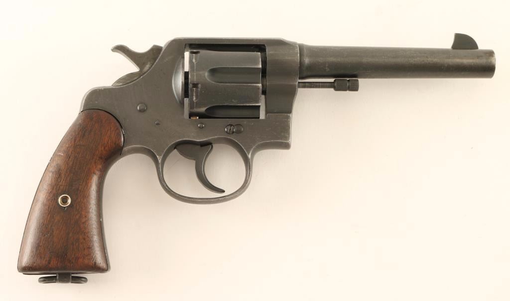 Finely refinished U.S. Military double-action service revolver chambered in .45 Automatic, circa 1919. Features a blued refinish, 5.5" barrel, blade front sight, "u" notched rear sight, fluted six-shot cylinder, non-shrouded ejector rod, smooth trigger, checkered hammer spur, lanyard ring, and two-piece smooth walnut grips. Markings: Frame - Rampant Colt, "U.S./ARMY/MODEL/1917" & "No/77/721". Barrel - "UNITED STATES PROPERTY", "COLT'S PT FA. MFG. CO. HARTFORD CT U.S.A./PATD AUG 5.1884 JUNE 5 1900 JULY 4 1905", "COLT D.A.45" & "10955". Revolver exhibits approximately 91% of it's old blued refinish showing some holster wear, scattered handling marks. and a faint drag line on the cylinder. Action is crisp with solid lock-up, bore is very good, markings are good and wood grips are very good. Condition is very good+ as refinished. ***C&R Firearm*** ***Modern Firearm***
