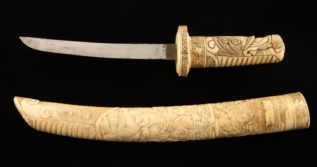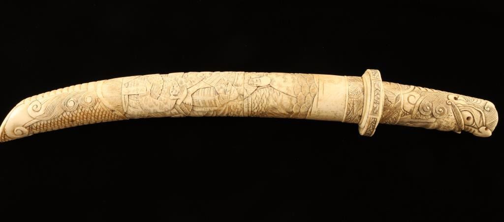 Beautifully carved elephant tusk with village scene on scabbard and dragon's head on handle. Measures 18" overall with a 7 3/8" blade which shows some wear.