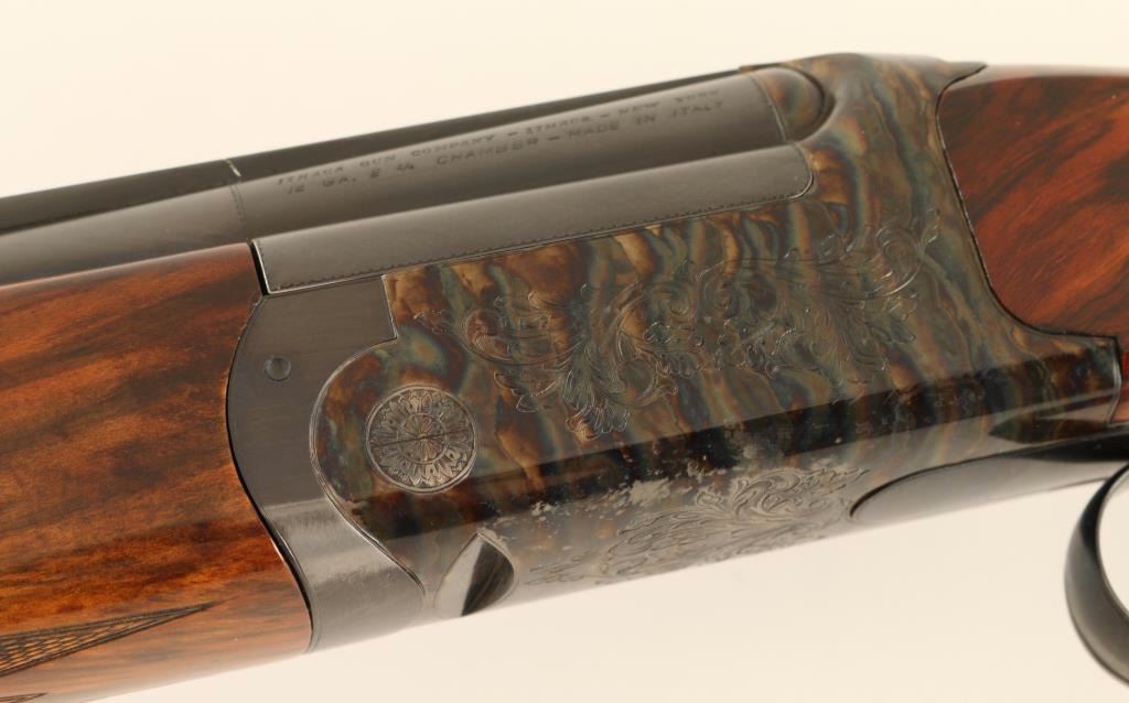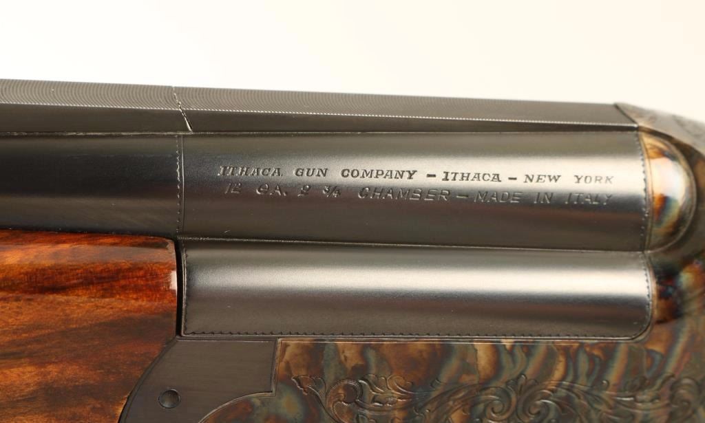 'Comp 1-Trap' Engraved high quality Italian made over/under double barrel shotgun chambered for 2 3/4" 12 Gauge shells, circa 1970. Imported by Ithaca Gun Company of Ithaca, New York with import marks on the top barrel. Features blued 26 3/4" barrels with a wide ventilated sighting rib, white bead front sight, silver bead mid-sight, automatic ejectors, finely floral scroll engraved receiver with case hardened finish, removable single trigger, checkered top lever, sliding tang safety, fancy checkered figured wood forearm and pistol grip shoulder stock with Kick Eez rubber recoil pad & 14 1/4" LOP. Shotgun exhibits approximately 93% of it's original finish showing some carrying wear on the underside of the receiver, edge/handling wear on the trigger guard and slide wear under the safety. Action is crisp, bores are pristine and wood stocks are very good with semi-worn checkering & small blemishes. Condition is near excellent. ***Modern Firearm***