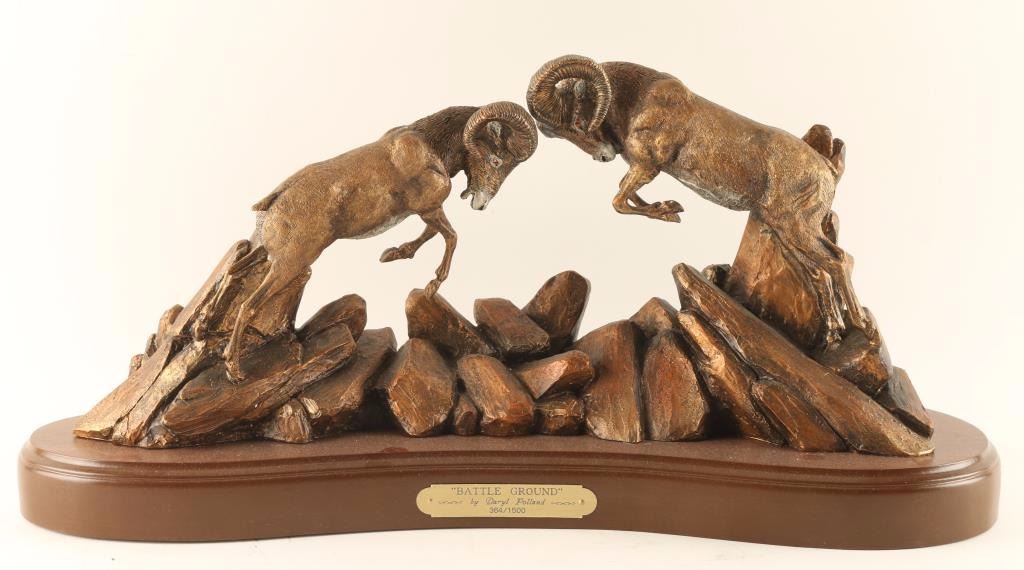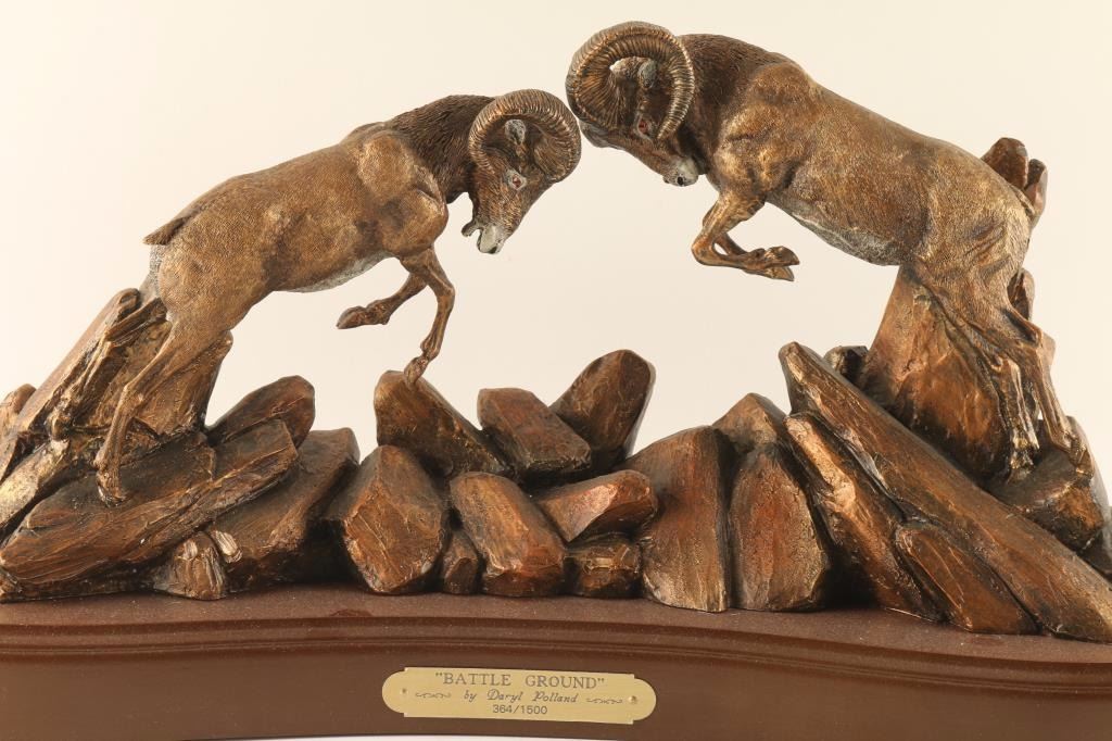 "Battle Ground" by Daryl Polland 364/1500. Depicting two bighorn sheep in battle. Wood base with brass title plate. Measures 21"l x 10 1/2"h x 6 1/2"w. Multicolored patina on resin.