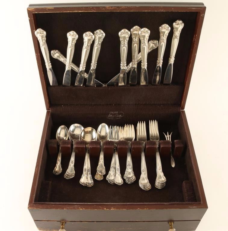 Chantilly pattern in silver cloth lined wooden box. Includes twelve five piece place settings-teaspoon, salad fork, dinner knife, dinner fork, cream soup spoon and a small sterling serving fork in another pattern. Marked 'Gorham Sterling'. Box shows age. Approx 4.15 pounds.