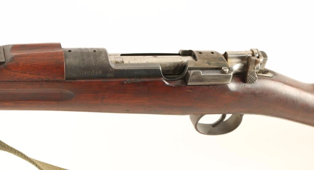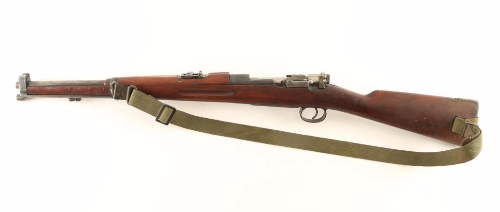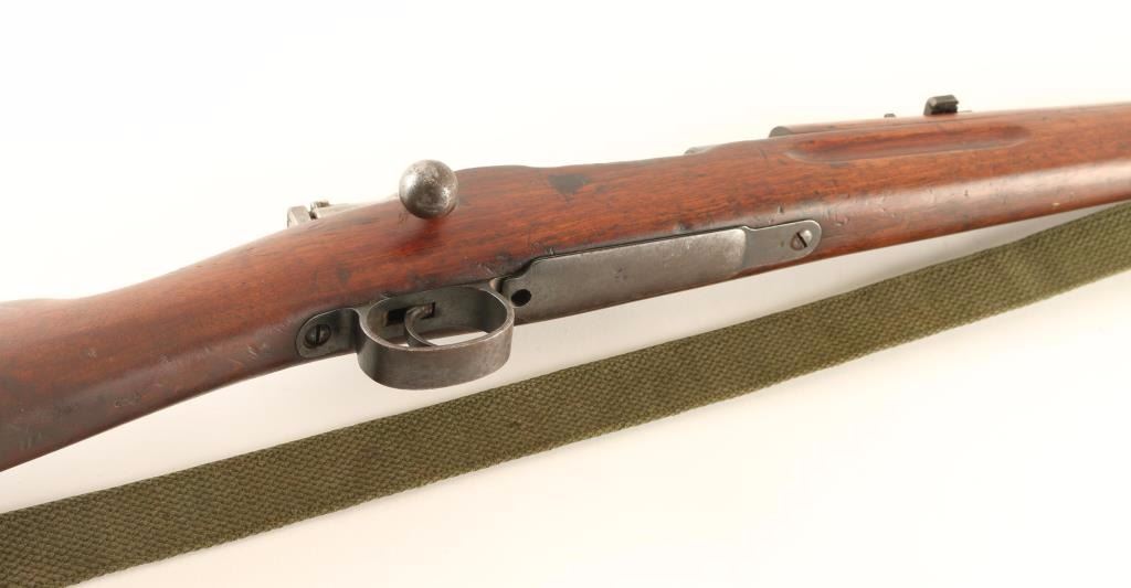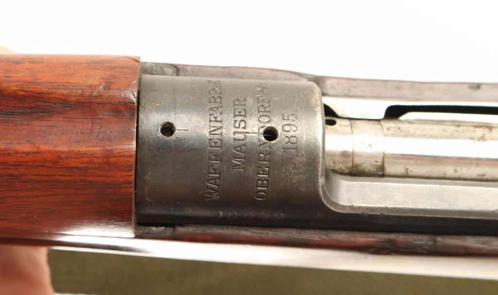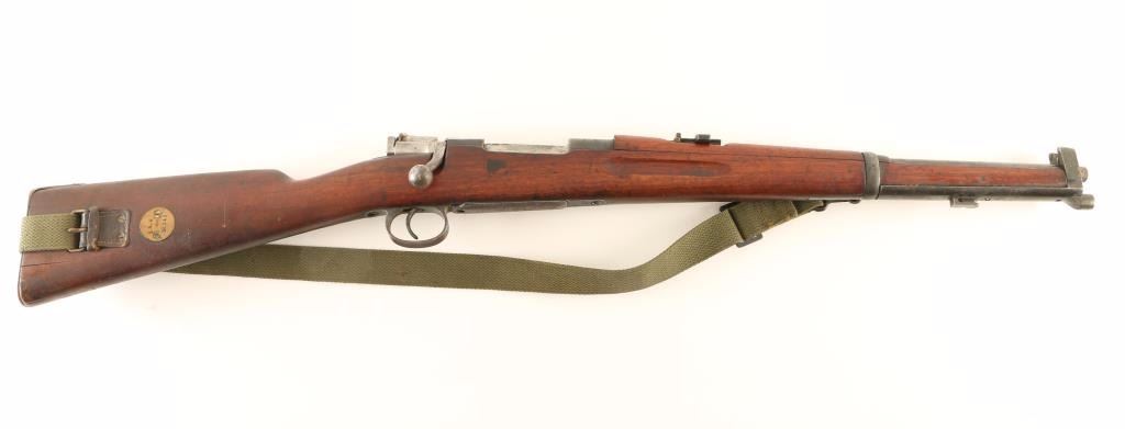 Scare antique Swedish military bolt-action service rifle chambered in 6.5x55mm, manufactures by Mauser circa 1895. Features a blued finish, 17.5" barrel, dovetailed inverted 'v' front sight, matching nose cap with bayonet lug & sight shroud, flip-up ladder rear sight graduated to 1,600 meters, drilled & tapped receiver, internal 5 round box magazine, turned down bolt, altered 'scope' safety, smooth trigger, green canvas sling, smooth wood handguard and straight grip shoulder stock with brass disc & smooth metal buttplate. All visible serial numbers are matching. Rifle exhibits approximately 20% of it's original blued finish showing heavy wear and scattered dark oxidation/rust. Action is strong, bore is dark with good rifling and wood stocks are very good+ with blemishes & an 1" hairline crack extending from the back of the receiver. Condition is very good. ***Antique Firearm***