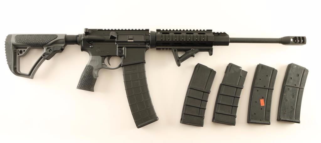 'Sportical' Customized semi-automatic AR platform rifle chambered in 5.56x45mm. Features a matte black finish, 16.25" barrel with 1/9 twist, large muzzle break, single rail gas black, carbine length quad-rail handguard with angled foregrip, AR-15 profile BCG, standard charging handle, shell deflector, dust cover, forward assist, push button magazine release, 40 round ProMag magazine, thumb safety, Daniel Defense grey pistol grip/trigger guard with textured rubber overmold and Daniel Defense six-position collapsible shoulder stock. Includes the original factory cardboard box with documents and four 30 round magazines by Thermold & Orlite. Rifle exhibits approximately 96% of it's matte black finish showing light scattered wear and a large scratch on the right side of the lower receiver. The right trigger guard ear on the lower receiver has broken off. Action is smooth, bore is excellent and stocks are fine. Condition is very good+++ in box. ***Modern Firearm***