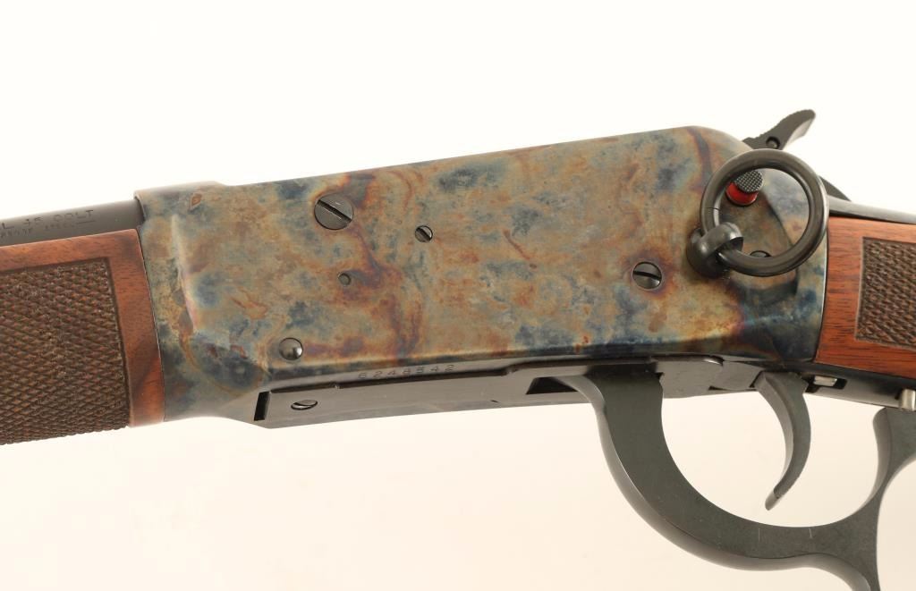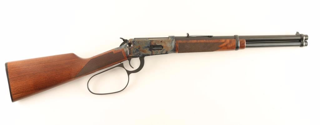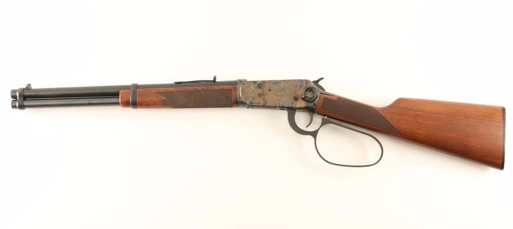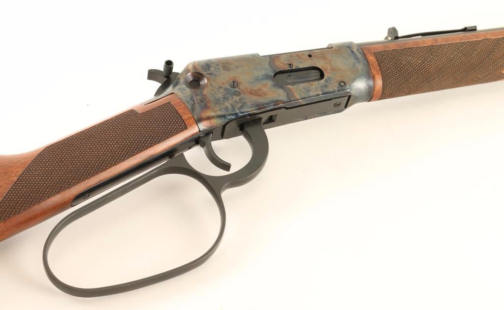 'Angle Eject - Trapper' Modern production lever-action repeating rifle chambered in .45 Colt. Features a blued/case hardened finish, 16" tapered barrel, dovetailed blade front sight, semi-buckhorn rear sight(missing ramp), drilled & tapped receiver, full-length magazine tube, saddle ring, serrated hammer spur with knurled extension, smooth trigger with beveled edges, grip safety, push button cross-bolt safety, large loop lever, two barrel bands, checkered walnut forend and straight grip shoulder stock with factory checkered black synthetic buttplate. Rifle exhibits approximately 99%+ of it's original finish showing only few minor handling marks with no other observed wear. Action is smooth, bore is pristine and wood stocks are fine with a couple semi-worn points. Condition is near new. ***Modern Firearm***
