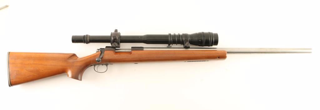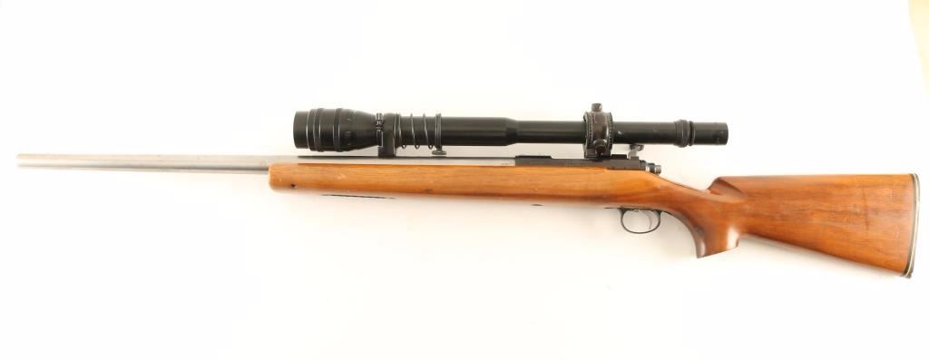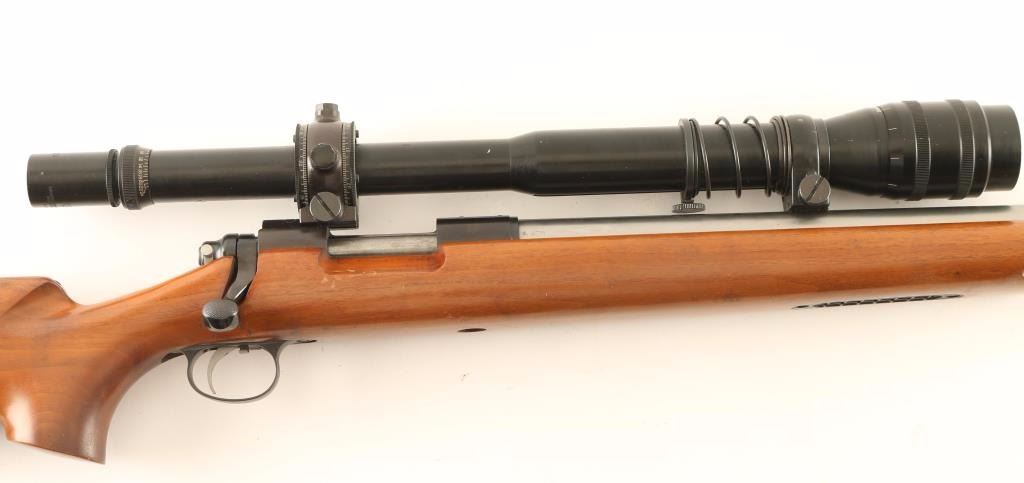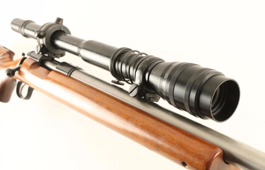 American made single shot bolt action competition target rifle chambered in .22-250 Remington, circa 1955-1964. Features a stainless steel 27.5" heavy barrel, Bausch & Lomb BALvar 6-24x scope, smooth adjustable trigger, manual safety, drilled & tapped receiver for a side mounted receiver sight, and smooth oversized walnut pistol grip shoulder stock with accessory rail in the forend. Rifle exhibits light handling marks & what appear to be dried oil stains on the barrel and retains approximately 40% of it' blued finish with the majority of the surface turned to a brown patina. Action is smooth, bore is excellent, optics are slightly hazy and wood stock is very good++ with some minor blemishes. Condition is very good. ***C&R Firearm*** ***Modern Firearm***