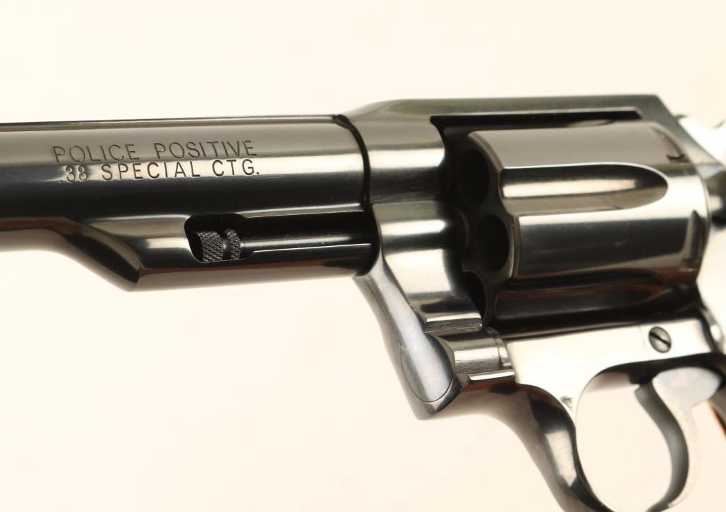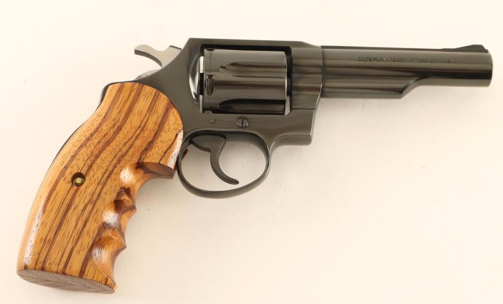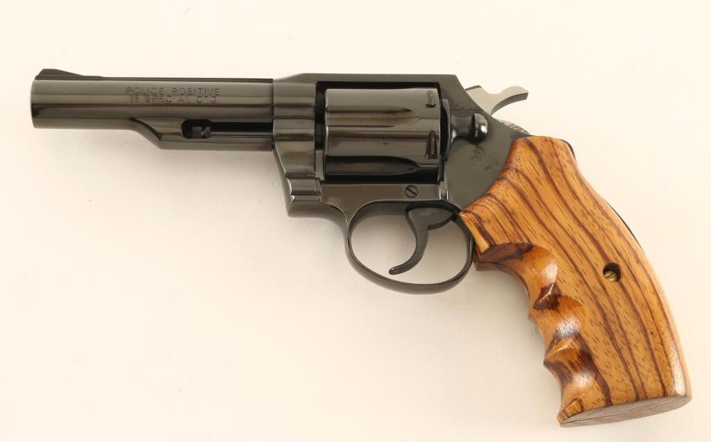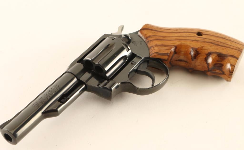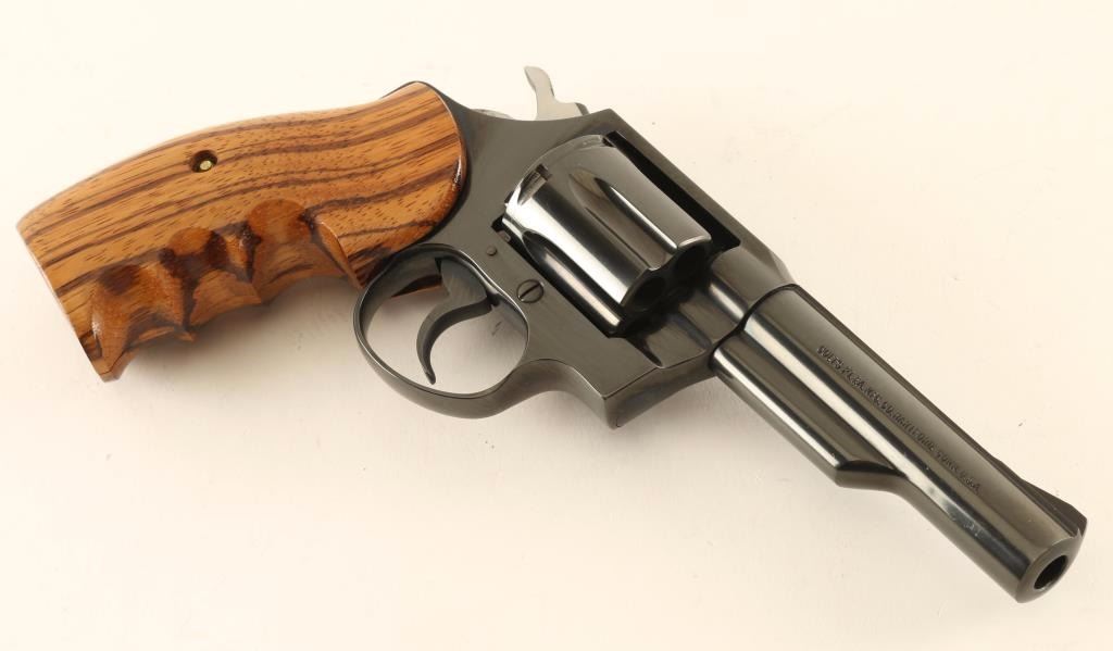 Small frame double action revolver chambered in .38 Special, circa 1977. Features a blued finish, 4" ribbed barrel, fixed ramp front sight, square notched rear sight, shrouded ejector rod, fluted six-shot cylinder, smooth trigger, serrated hammer spur, and custom two-piece smooth wood finger groove grips. Revolver exhibits approximately 97% of it's original blued finish showing some light handling marks/scratches and a faint drag line on the cylinder. Action is smooth with solid lock-up, bore is pristine and wood grips are fine. Condition is excellent. ***Modern Firearm***