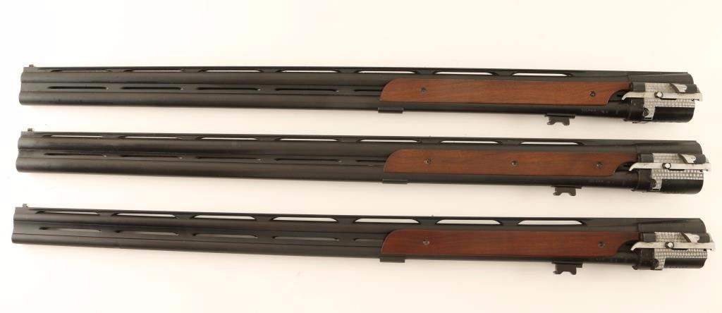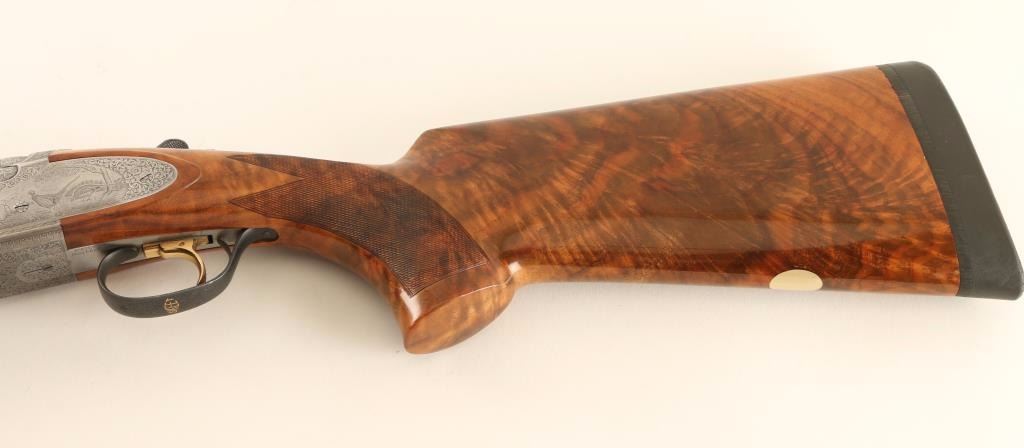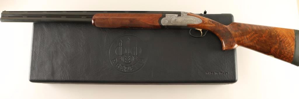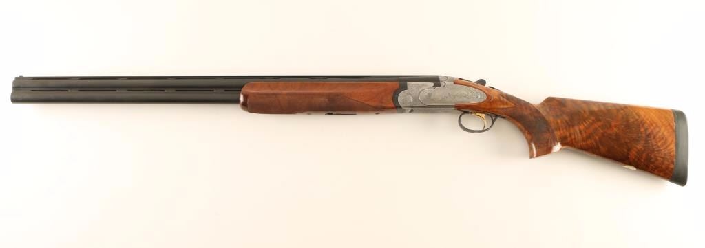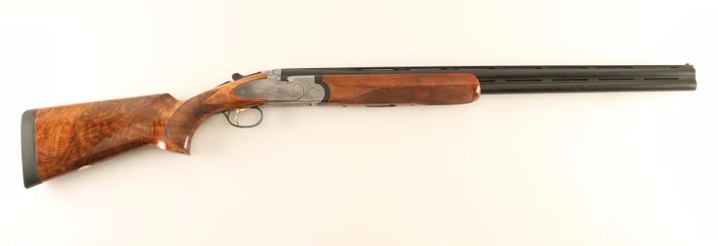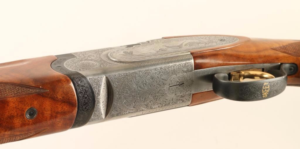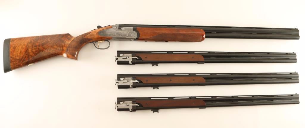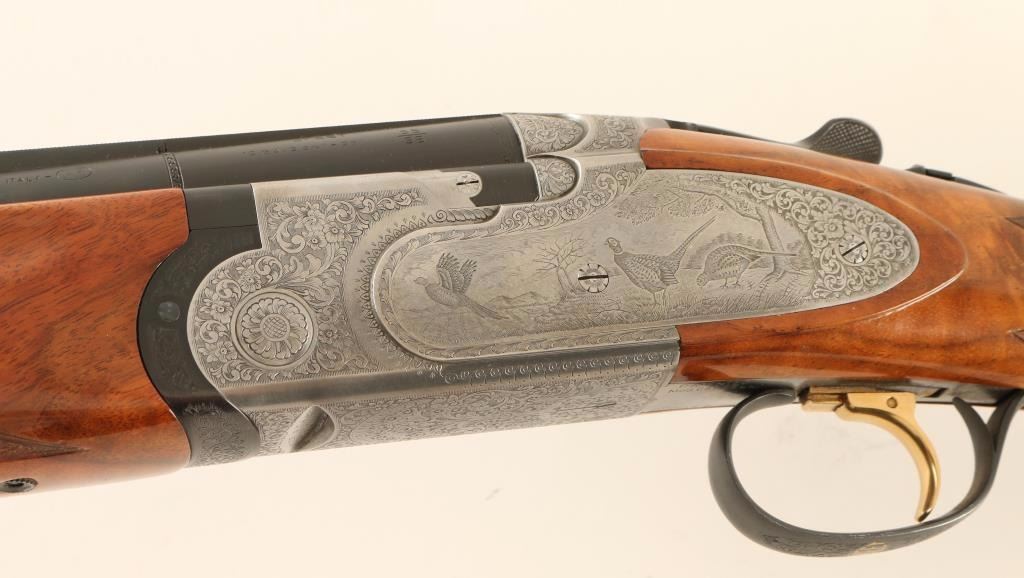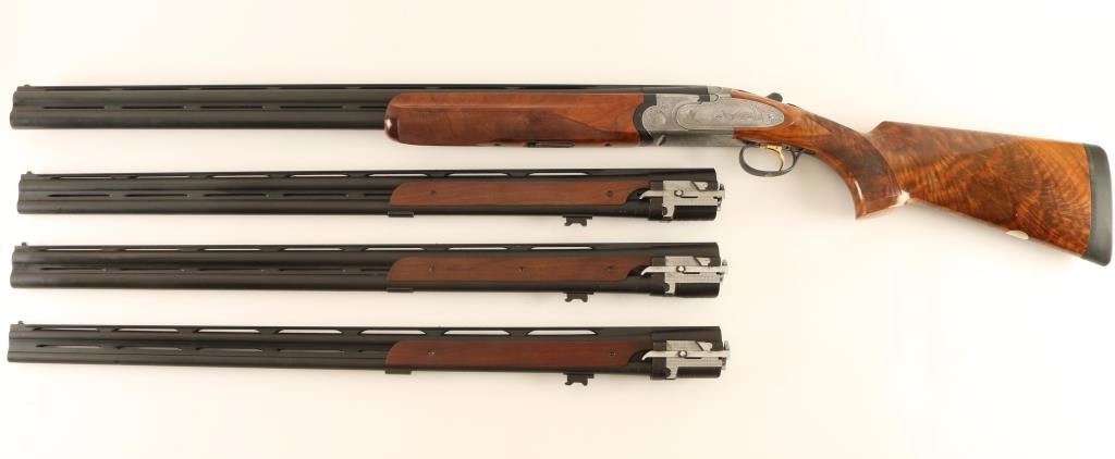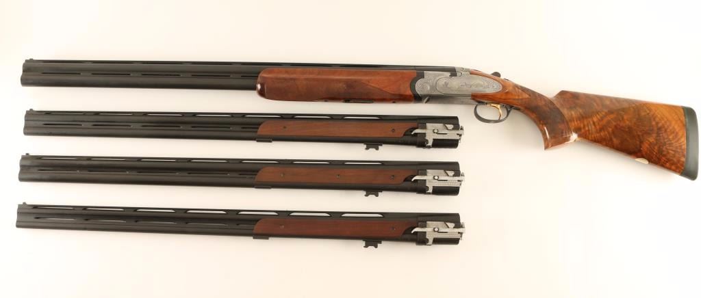 SN: L08602B 'Diamond Pigeon' Beautiful Italian made over/under four barrel skeet shotgun set chambered for .410, 28, 20 & 12 gauge, finely engraved & signed by master engraver Bottega C Giovanelli, circa 1993. Features matte blued 28" 12 gauge barrels with ventilation ribs & SB/SB chokes, automatic ejectors, white bead front sight, silver bead mid-sight, master engraved coin finished receiver with ornate game bird scenes surrounded by beautiful floral scroll, adjustable single smooth gold trigger, sliding tang safety with barrel selector, high gloss checkered walnut semi-beavertail forend and pistol grip shoulder stock with Kick-Eez recoil pad(14 1/4" LOP with it's current trigger position). Includes a locking factory hard case with three addition 28" serialized barrels marked skeet with 2 3/4" chambers & SB/SB chokes in 20, 28 & .410 gauge. Shotgun exhibits approximately 98% of it's original finish overall with minimal wear or handling marks observed. Action is crisp, bores are pristine and wood stocks are near fine with a few light dings on the left side of the shoulder stock. Condition is excellent. ***Modern Firearm***