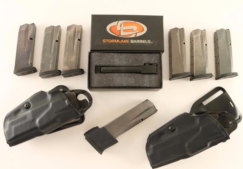 Full size striker fired semi-automatic pistol chambered in 45 Automatic. Features a black finished stainless steel slide with dual cocking serrations, Storm Lake 4.6" stainless barrel, dovetailed three-dot suppressor sights with tritium inserts, trigger safety, ambidextrous thumb safety, push button magazine release, 10 round factory magazine, and black polymer frame with integral accessory rail & interchangeable palm swell insert. Includes the original factory hard case with documents, lock, original barrel, two additional palm swell inserts, six extra 10 round factory magazines, a 14 round extended factory magazine, and two Safariland holsters. Pistol exhibits approximately 98% of it's black finish showing minor holster wear and some slide wear on the top of the barrel. Action is smooth, bore is pristine and polymer is fine. Condition is excellent in case. ***Modern Firearm***
