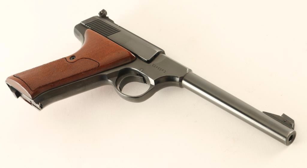 'Third Series' Single action semi-automatic target pistol chambered in .22 Long Rifle, circa 1974. Features a blued finish, 6" straight taper barrel, ramped patridge front sight, adjustable rear window sight, smooth wide trigger, factory 10 round magazine, thumb safety, slide stop, and two-piece checkered walnut target style grips. Pistol exhibits approximately 94% of it's original blued finish showing light muzzle wear, some small blemishes, a single spot of light surface rust on the barrel and mild wear on the grip straps. Action is smooth, bore is excellent, and wood grips are near fine with some small blemishes. Condition is very good+++. ***Modern Firearm***