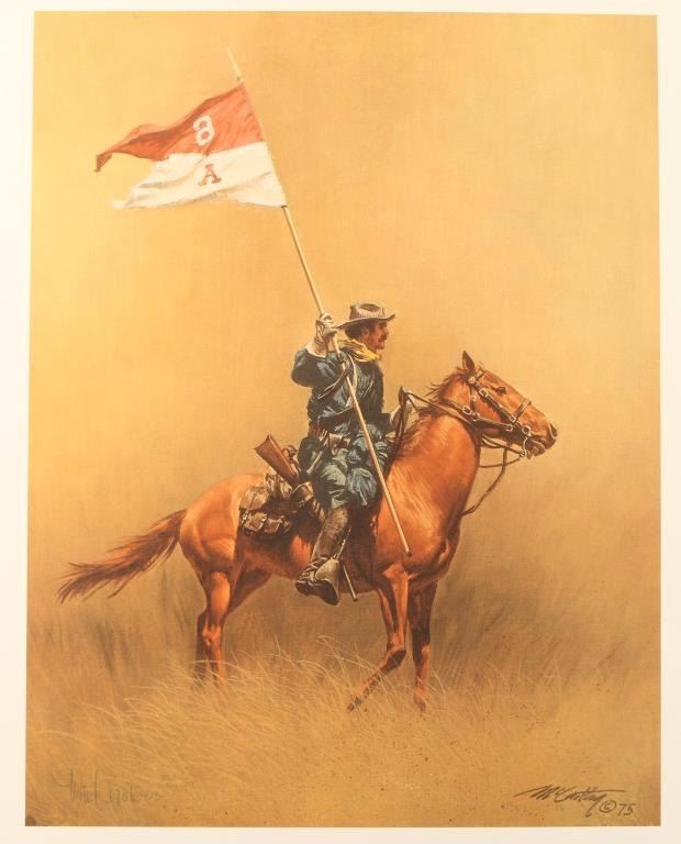 "The Trooper" 675/1000 hand signed in pencil lower left. Image measures 16 5/8"x12 3/4". Print only with information on the artist in Greenwich Workshop folio. Frank McCarthy was born in New York City and was drawn to the West since he read Will James novels as a boy. He was also intrigued by N.C. Wyeth illustrations. Frank McCarthy's formal training was at the Pratt Institute and had a career in commercial art and as an illustrator. The lure of the West was strong and he eventually settled in Sedona, AZ and became a member of the Cowboy Artists of America. Frank has had several shows in prominent museums and his work has appeared in many national magazines.