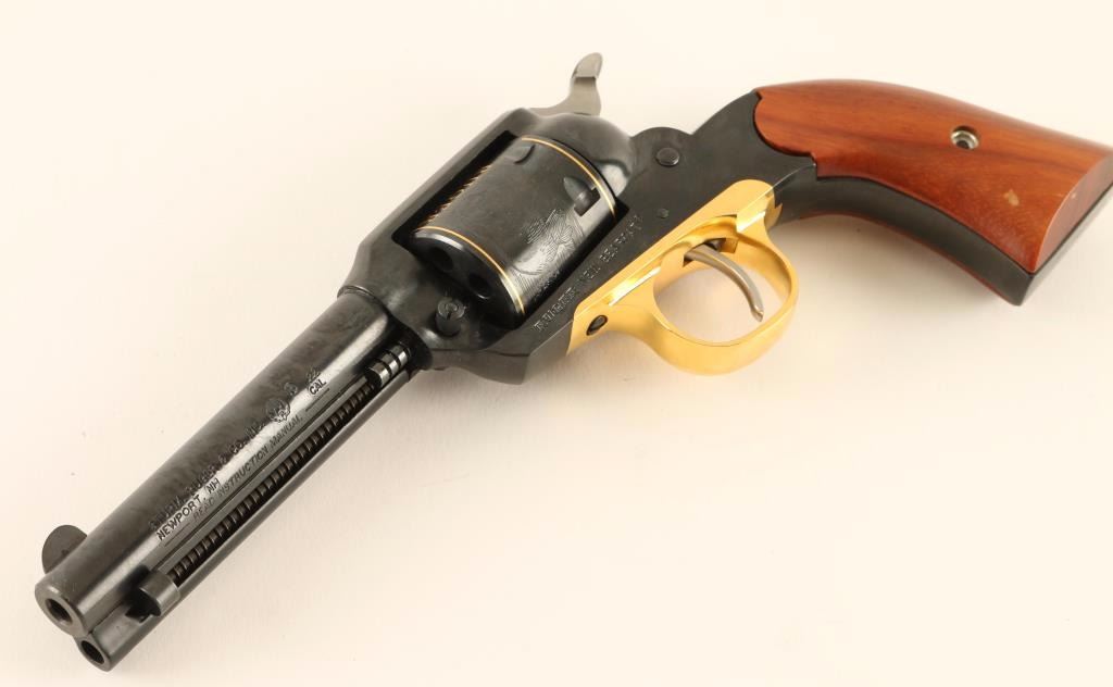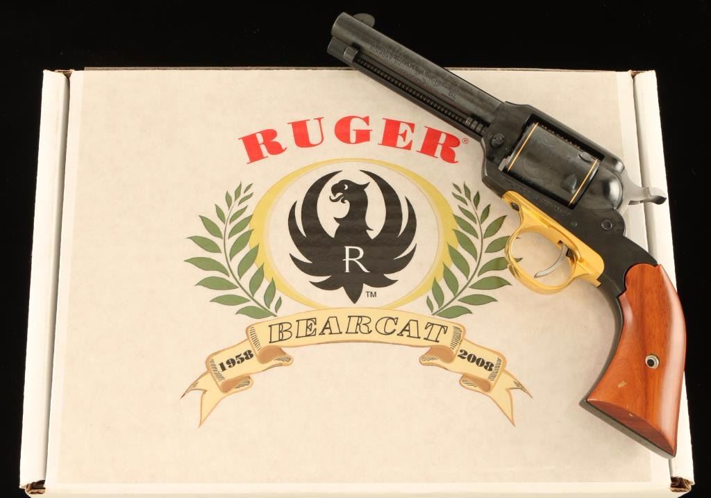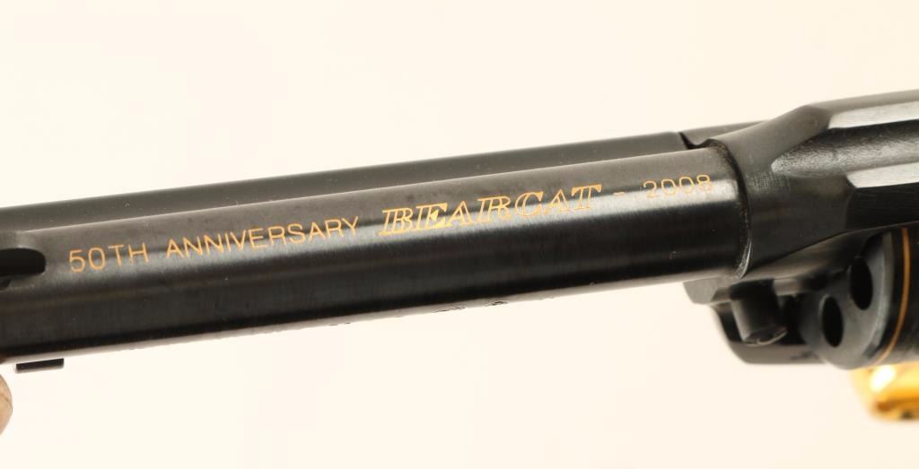 '50th Anniversary' Small frame single-action revolver modeled along the lines of the Remington 1890 and chambered in .22 Long Rifle, circa 2008. Features a blued finish with 14 karat gold embellishment, 4" barrel marked "50TH ANNIVERSARY BEARCAT - 2008", blade front sight, square notched rear sight, ejector rod, steel frame, non-fluted six shot cylinder with engraved bear & cat scenes, gold plated trigger guard, serrated wide hammer spur, smooth trigger and two-piece smooth wood grips. Includes the original factory cardboard box with factory soft case, documents, spent case and lock. Revolver exhibits approximately 99% of it’s original finish showing minimal handling marks and a faint drag line. Action is crisp with solid lock-up, bore is excellent, and wood grips very near fine. Condition is near new in box. ***Modern Firearm***