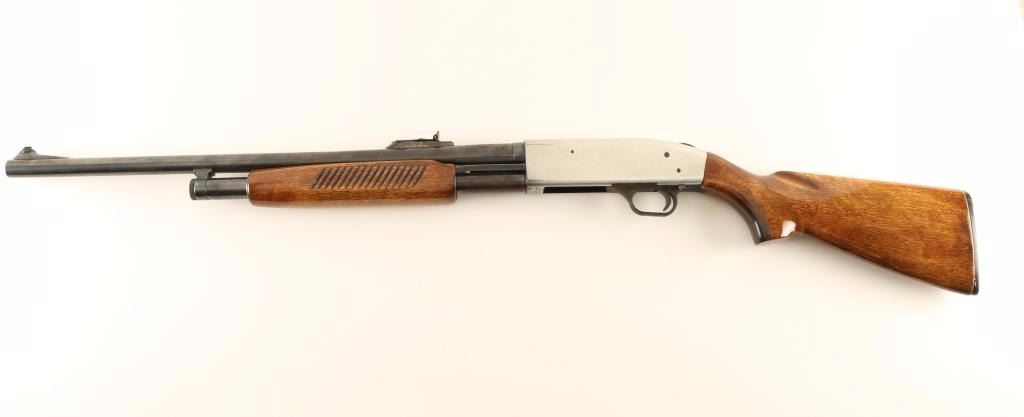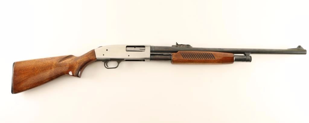 American made slide action repeating shotgun chambered for 2 3/4" 12 gauge shells. Features a reblued 24" full choked barrel, ramped blade front sight, raised adjustable rear sporting sight, 2/3 length magazine tube, cleaned alloy receiver, sliding safety, beveled trigger, high gloss grooved wood slide handle and smooth pistol grip shoulder stock with black hard rubber buttplate. The barrel and magazine tube exhibit approximately 65% of their blued refinish showing moderate/heavy scattered oxidation & rust. The receiver has been cleaned and is primarily in the white. Action is smooth, bore is good with debris or rust and the refinished wood stocks are very good with only minor imperfections. Condition is good. ***Modern Firearm***