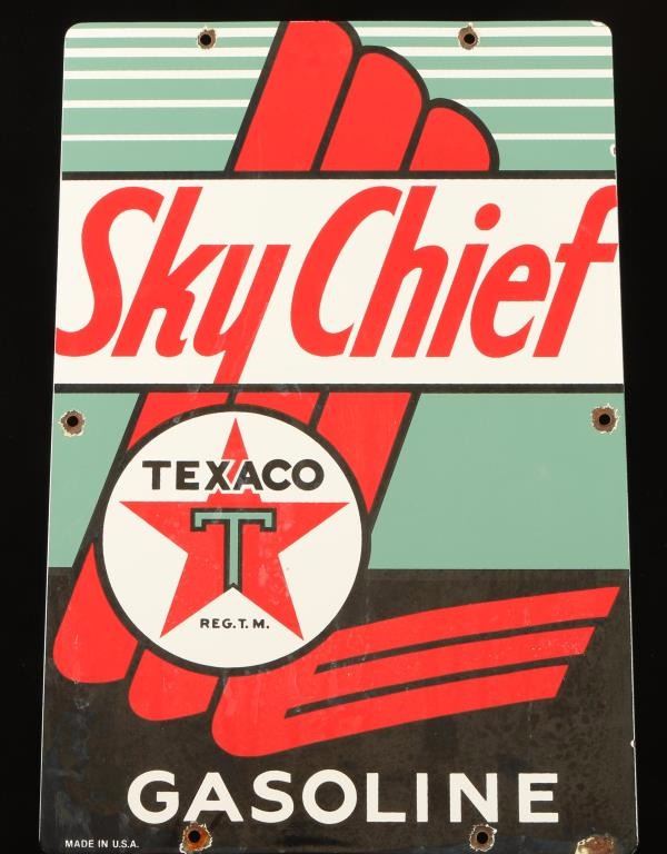 Measures 12"w x 18" h. The front reads 'Sky Chief Texaco Reg TM Gasoline Made in U.S.A.'. Has smooth porcelain on both sides.