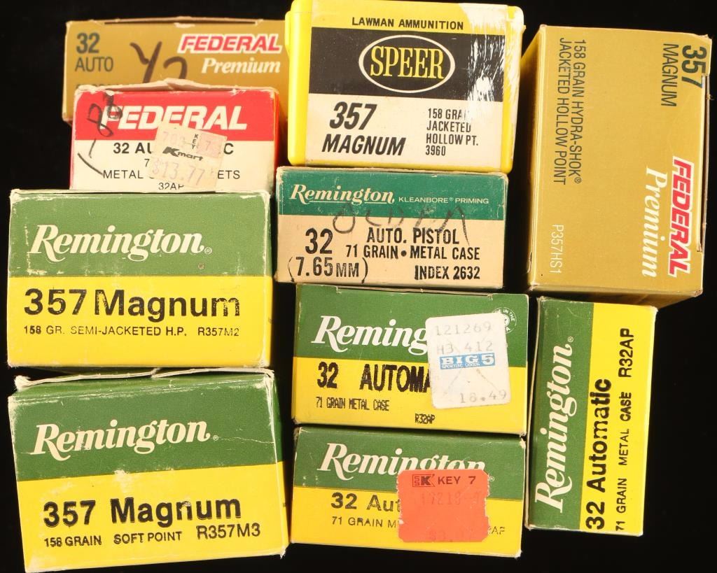 150 Rds of 32 Auto by Remington and 75 Rds of 32 by Federal and 50 Rds of Vintage 32A by Remington. 150 Rds of .357 by Remington and Speer, and 20 Rds.357 by Federal.